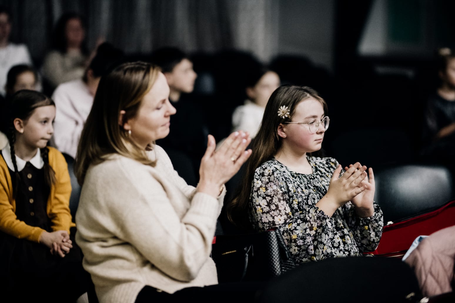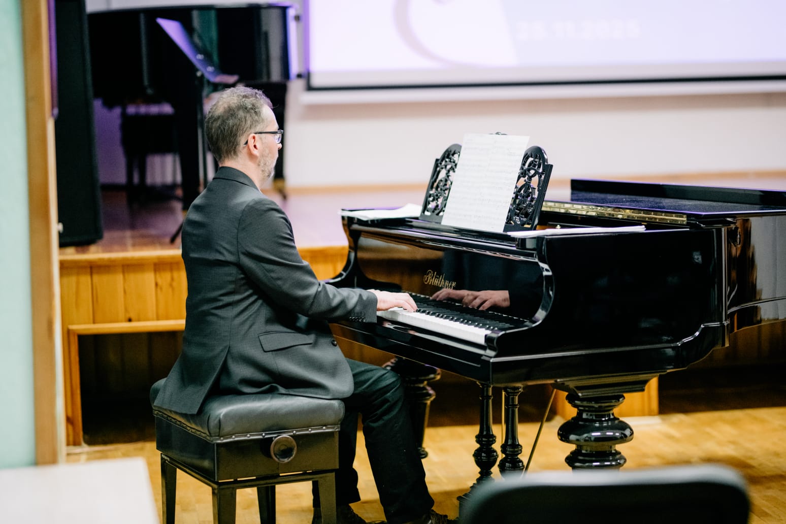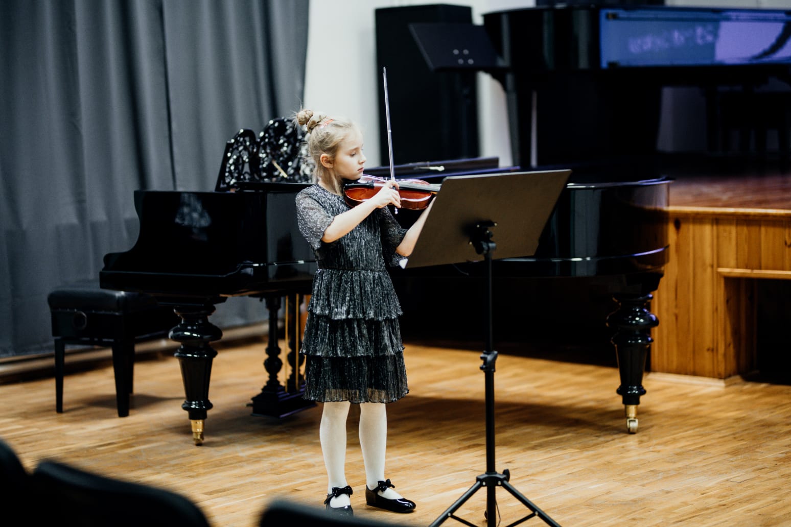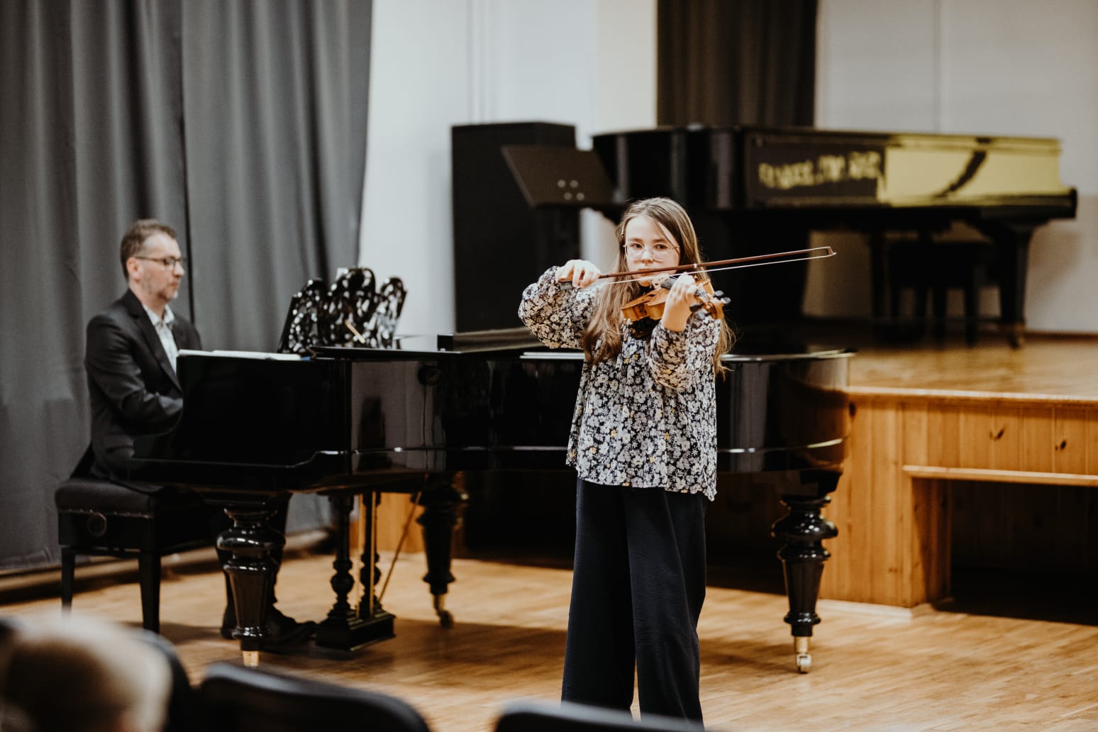 We wtorkowy (25.11.2025) wieczór odbył się popis klasy skrzypiec pani Kingi Biesiadeckiej. Młodzi artyści zaprezentowali wybrane utwory z literatury dziecięcej oraz klasycznej. Wśród nich znalazły się dobrze znane melodie, takie jak "Stary niedźwiedź mocno śpi", czy "Panie Janie", a także kompozycje w tanecznym rytmie: "Tango" autorstwa Mirosława Gąsieńca oraz "Kujawiak a-moll" skomponowany przez Henryka Wieniawskiego.