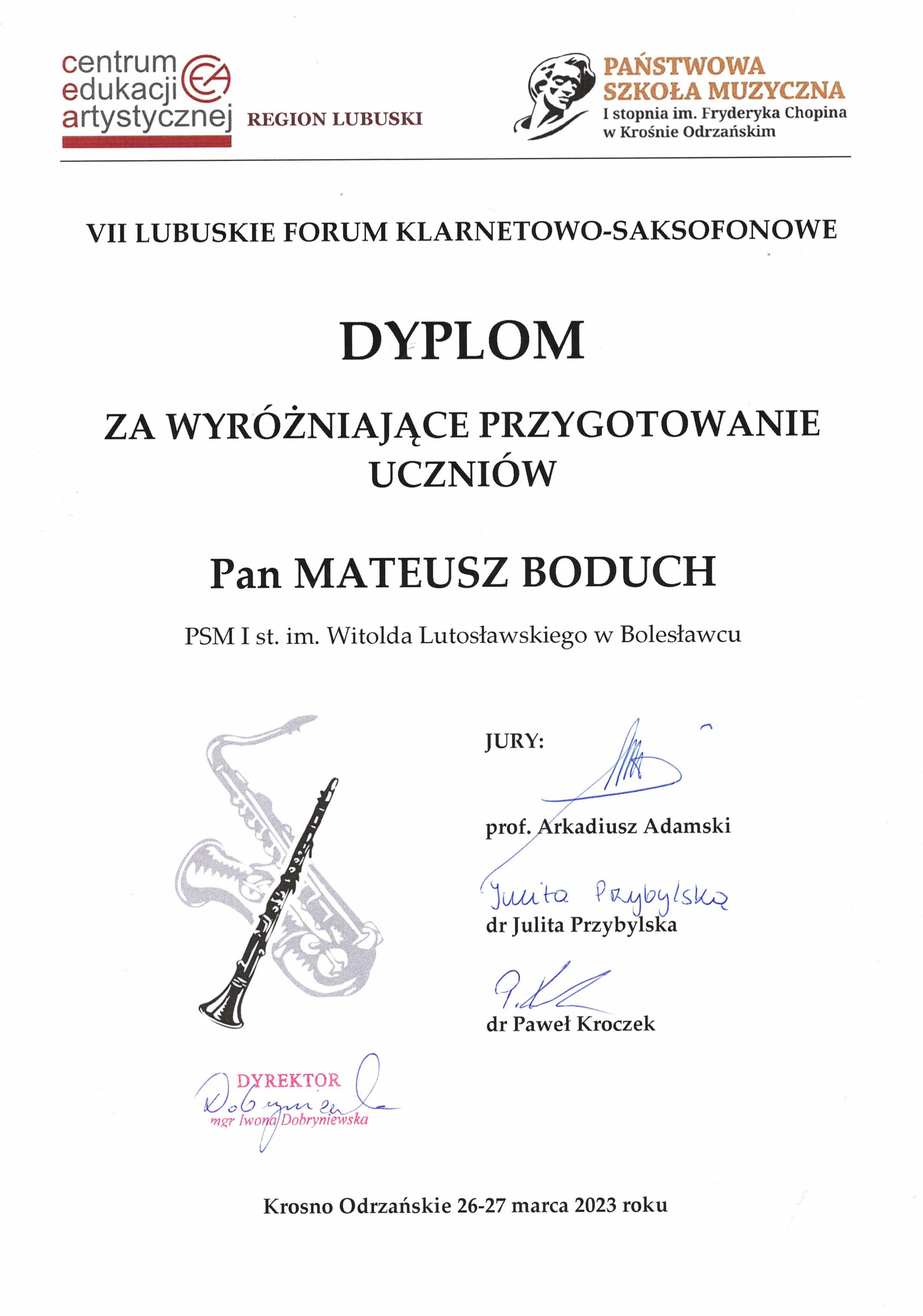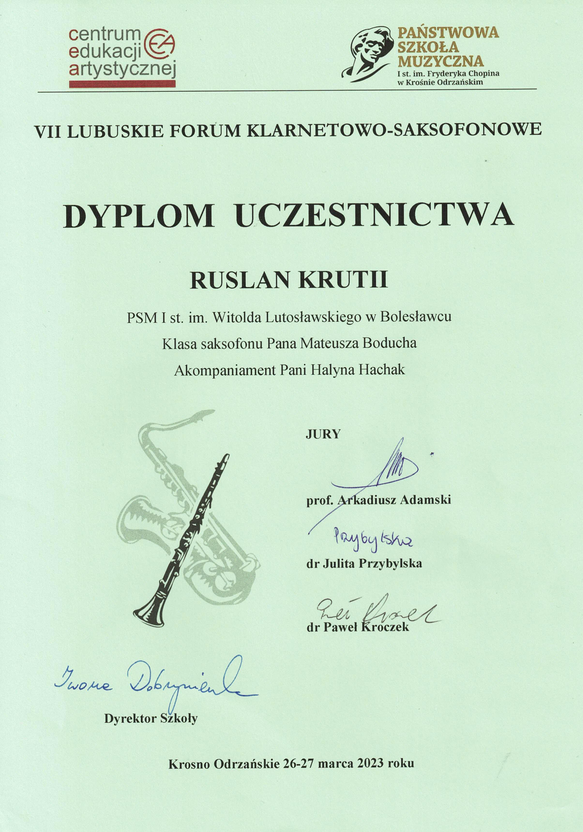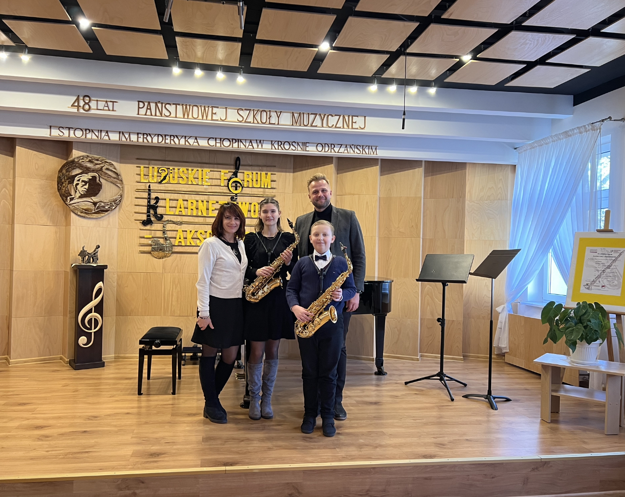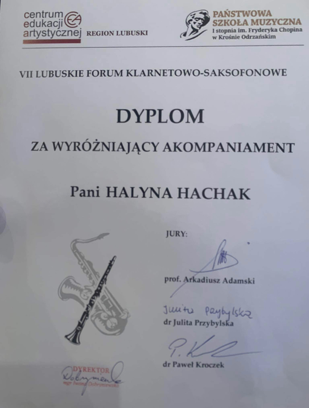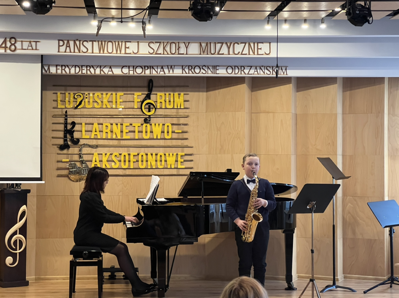 Uczniowie klasy saksofonu - Ruslan Krutii oraz Oliwia Mikołajewska wzięli udział w VII Lubuskim Forum Klarnetowo-Saksofonowym w Krośnie Odrzańskim. Konkurs odbył się pod patronatem Centrum Edukacji Artystycznej. W konkursie udział wzięło ponad 70 młodych saksofonistów i klarnecistów z całego kraju. Uczennica Oliwia Mikołajewska zdobywa II miejsce w swojej kategorii. Dyplom za wyróżniający akompaniament otrzymała Pani Halyna Hachak, natomiast Pan Mateusz Boduch otrzymał dyplom za wyróżniające przygotowanie uczniów. Ogromne gratulacje.
