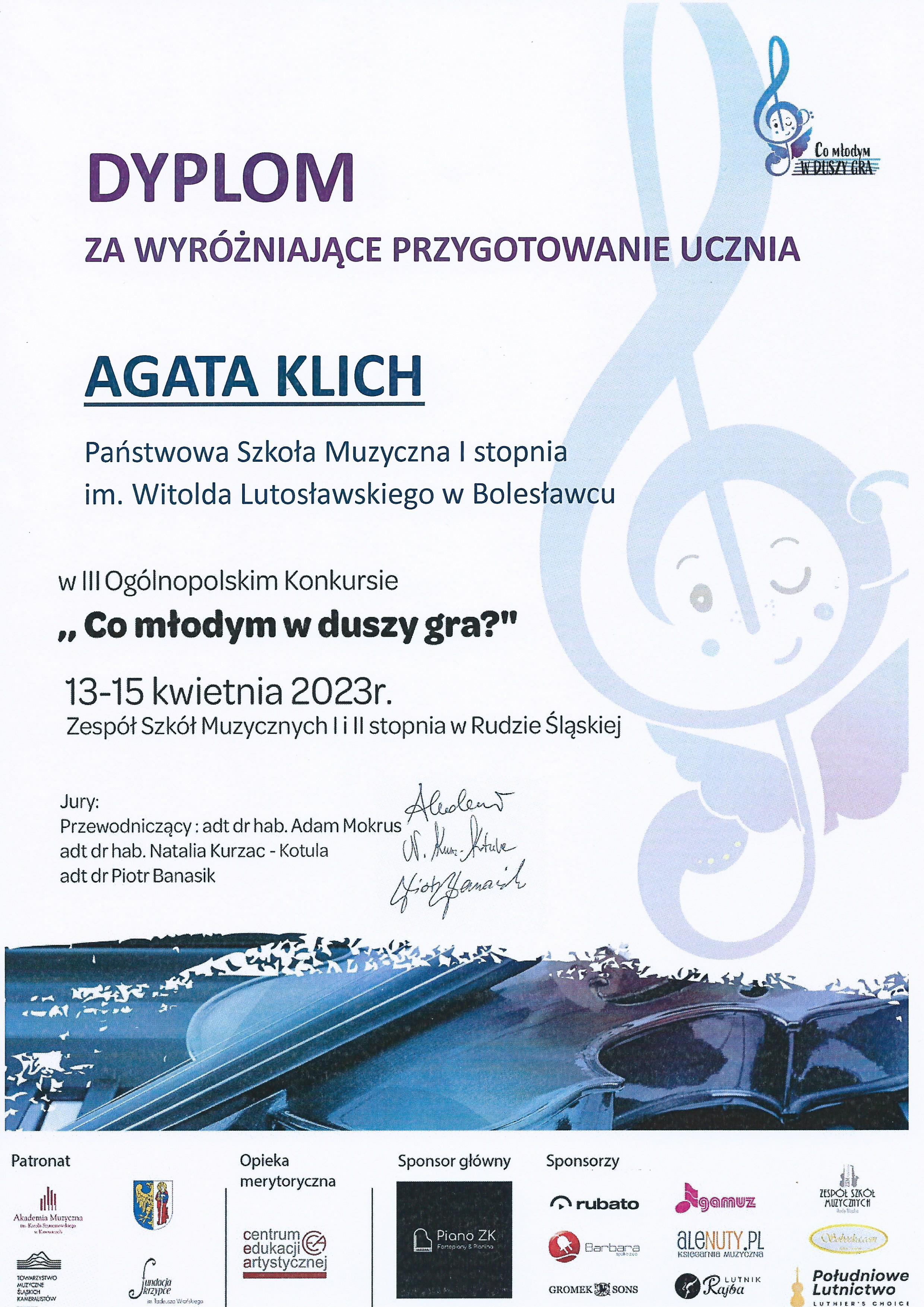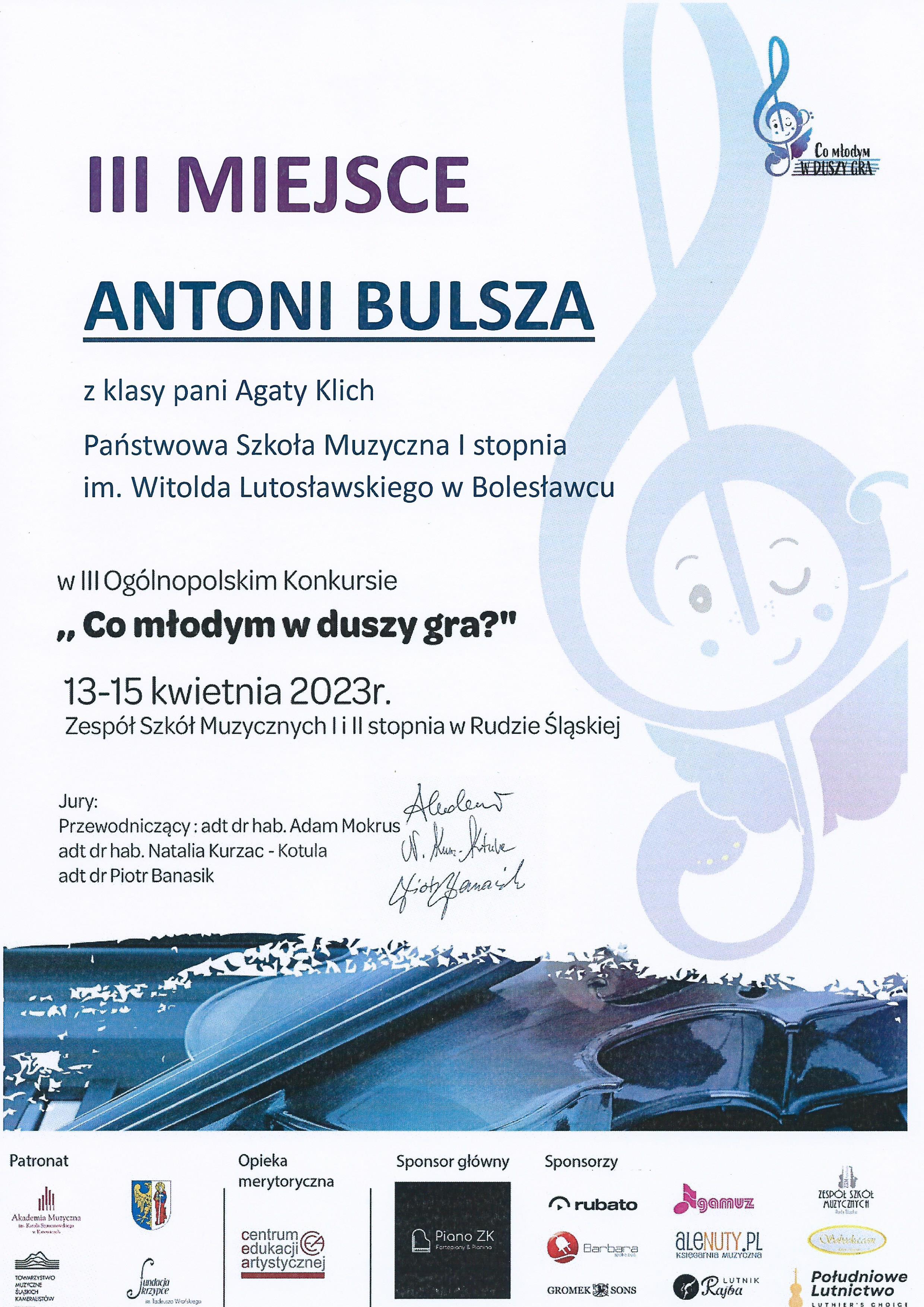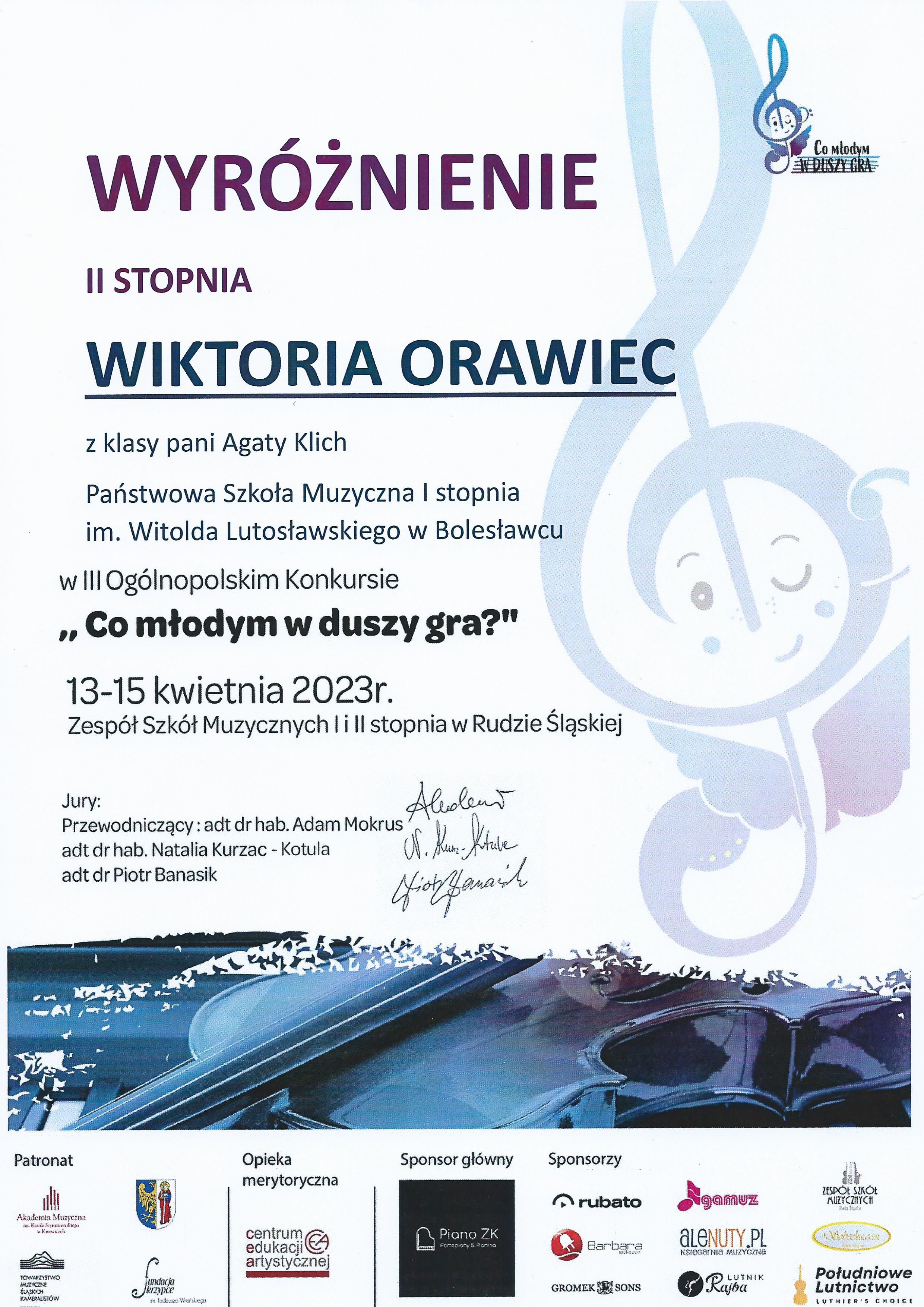 Uczniowie klasy skrzypiec Pani Agaty Klich – Wiktoria Orawiec i Antoni Bulsza wzięli udział w III Ogólnopolskim Konkursie „Co młodym w duszy gra?” w Rudzie Śląskiej. W konkursie uczestniczyło łącznie ponad 160 uzdolnionych, młodych skrzypków, wiolonczelistów i pianistów z całego kraju. Antoni zajął III miejsce, natomiast Wiktoria zdobyła wyróżnienie II stopnia! Dodatkowo za wyróżniający akompaniament dyplom zdobyła Pani Liliia Tarasenko. Także Pani Agata Klich otrzymała dyplom za wyróżniające przygotowanie uczniów. Ogromne brawa!👏