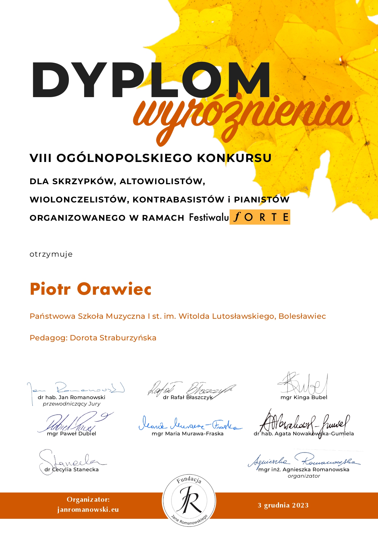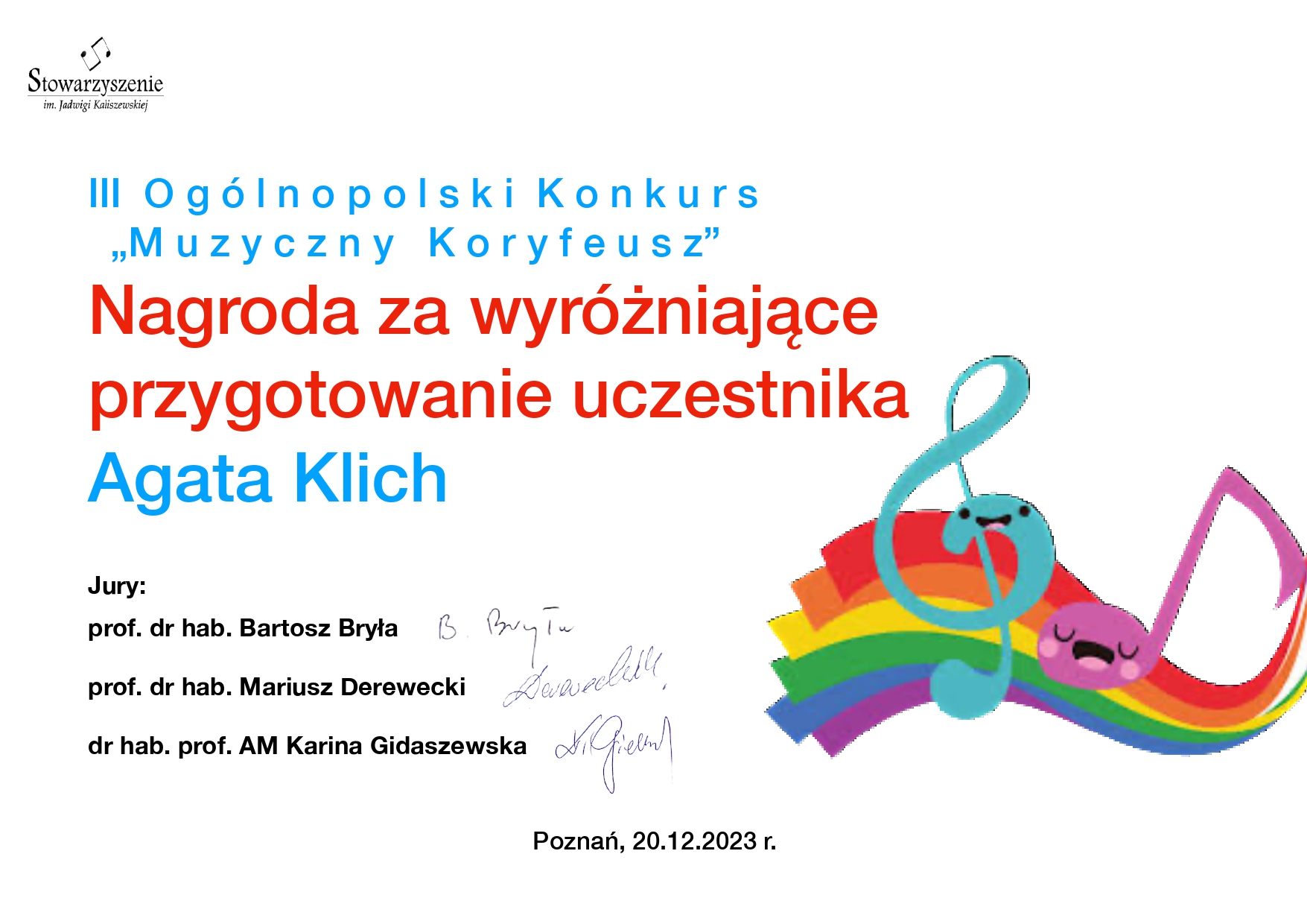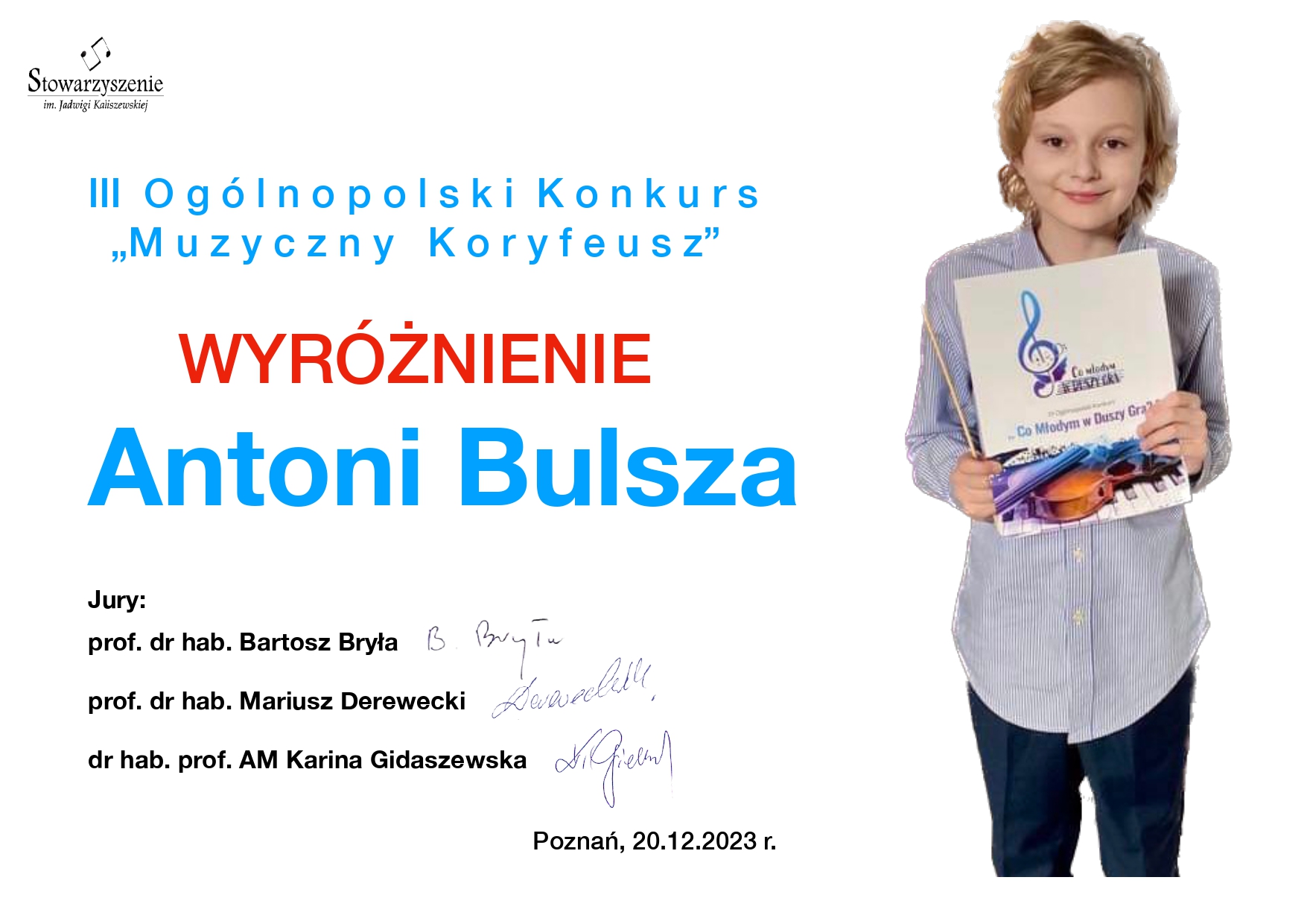 otrzyma艂 wyró偶nienie w III Ogólnopolskim Konkursie ,,Muzyczny Koryfeusz". Z kolei Pani Liliia Tarasenko zosta艂a nagrodzona za wyró偶niaj膮cy akompaniament, a Pani Agata Klich za przygotowanie ucznia.