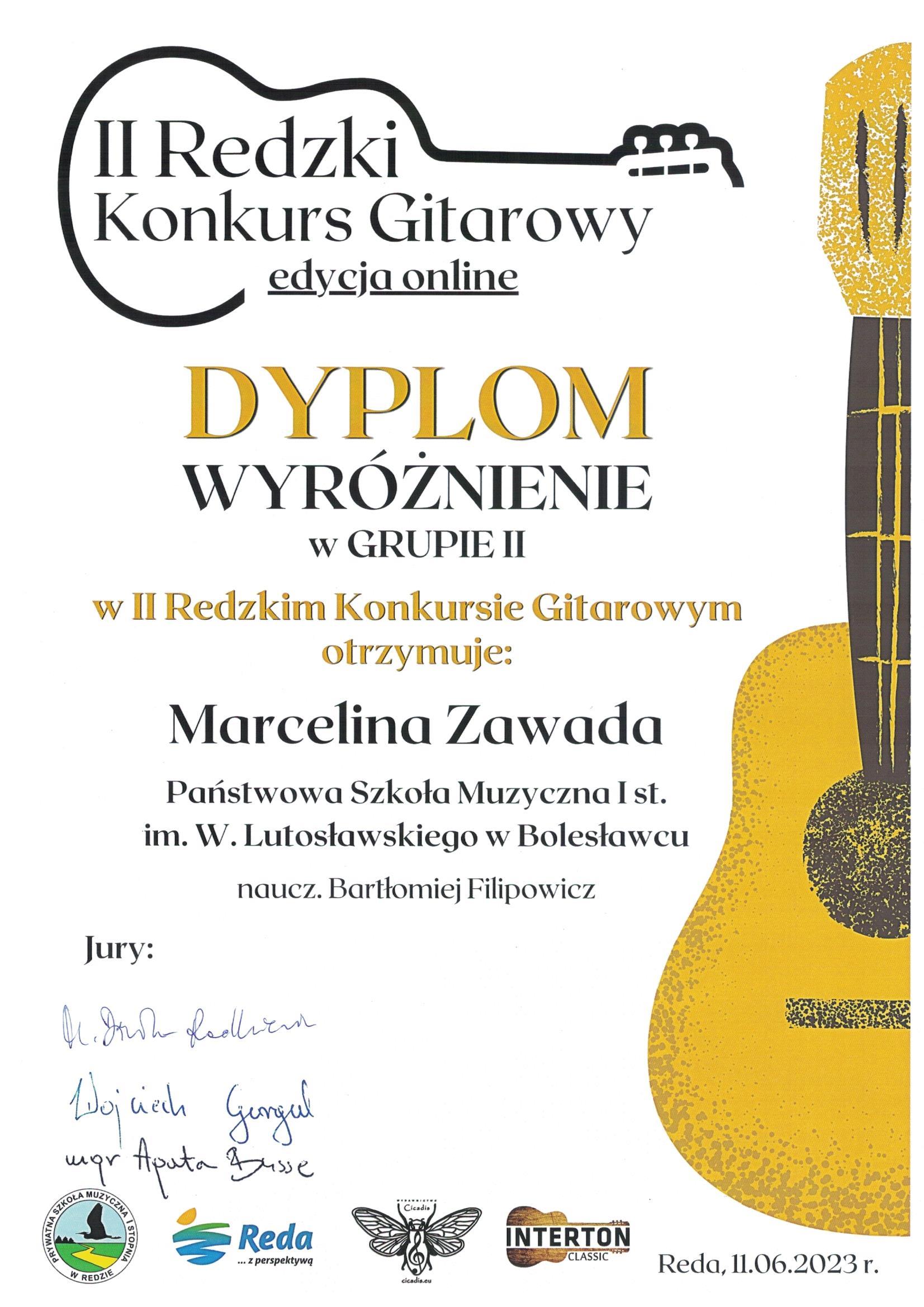 Z ogromn膮 rado艣ci膮 informujemy, 偶e Marcelina Zawada z II klasy gitary cyklu czteroletniego pana Bart艂omieja Filipowicza zdoby艂a wyró偶nienie w II Redzkim Konkursie Gitarowym! Konkurs odbywa艂 si臋 w formule online.