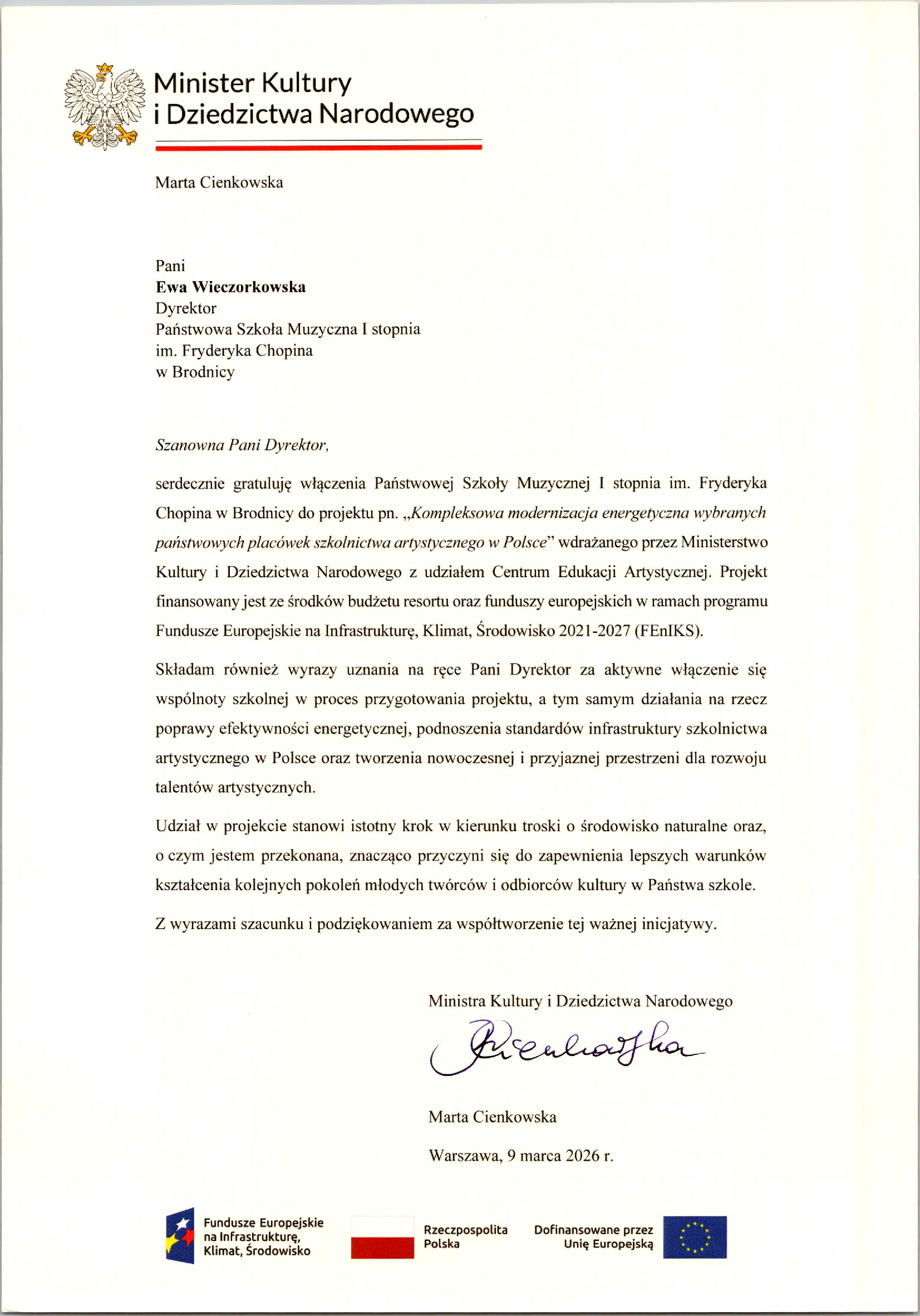 Z radością informujemy, że 9 marca 2026 roku Państwowa Szkoła Muzyczna I stopnia im. Fryderyka Chopina w Brodnicy została włączona do ogólnopolskiego projektu pn. „Kompleksowa modernizacja energetyczna wybranych państwowych placówek szkolnictwa artystycznego w Polsce”.