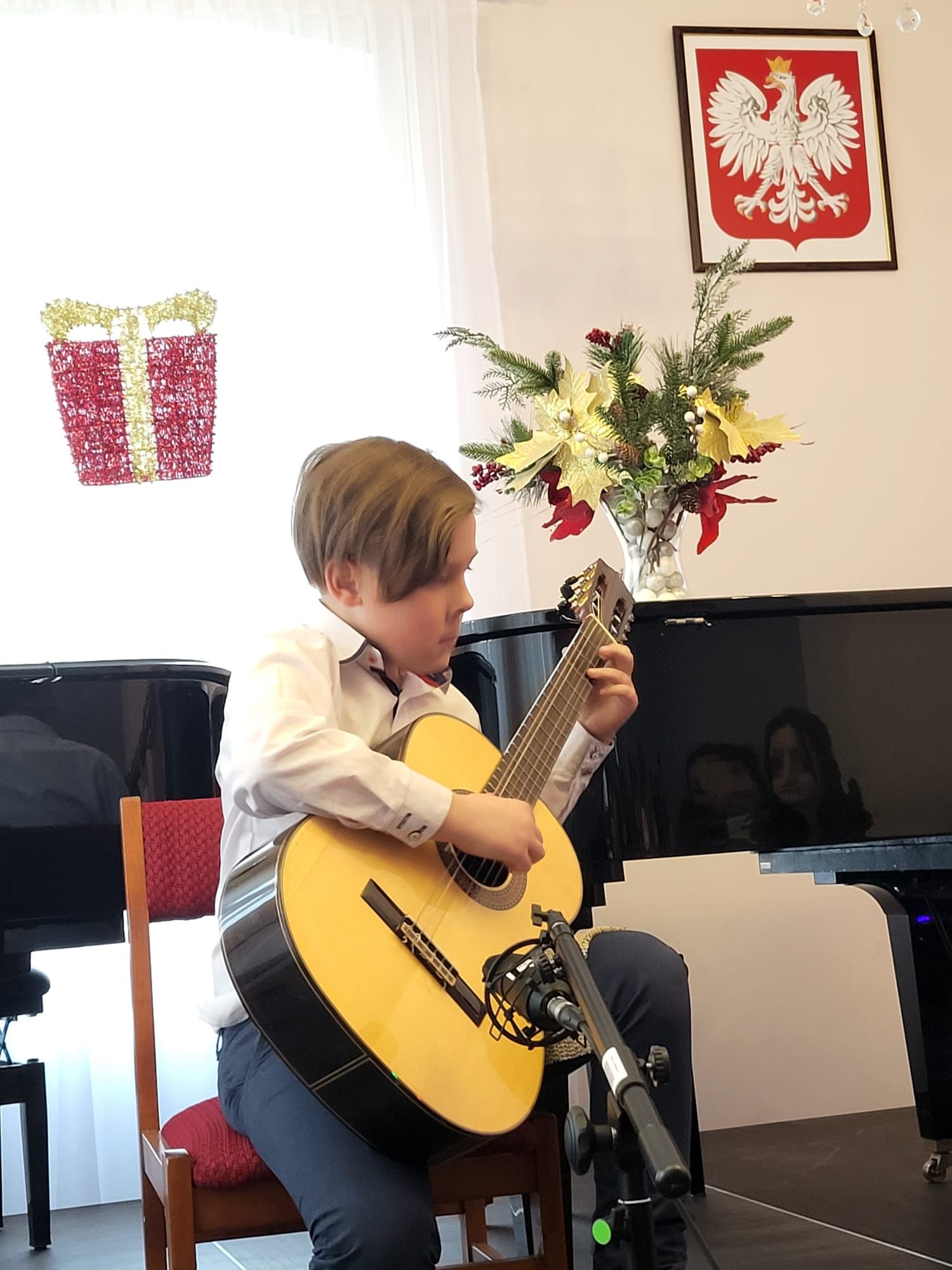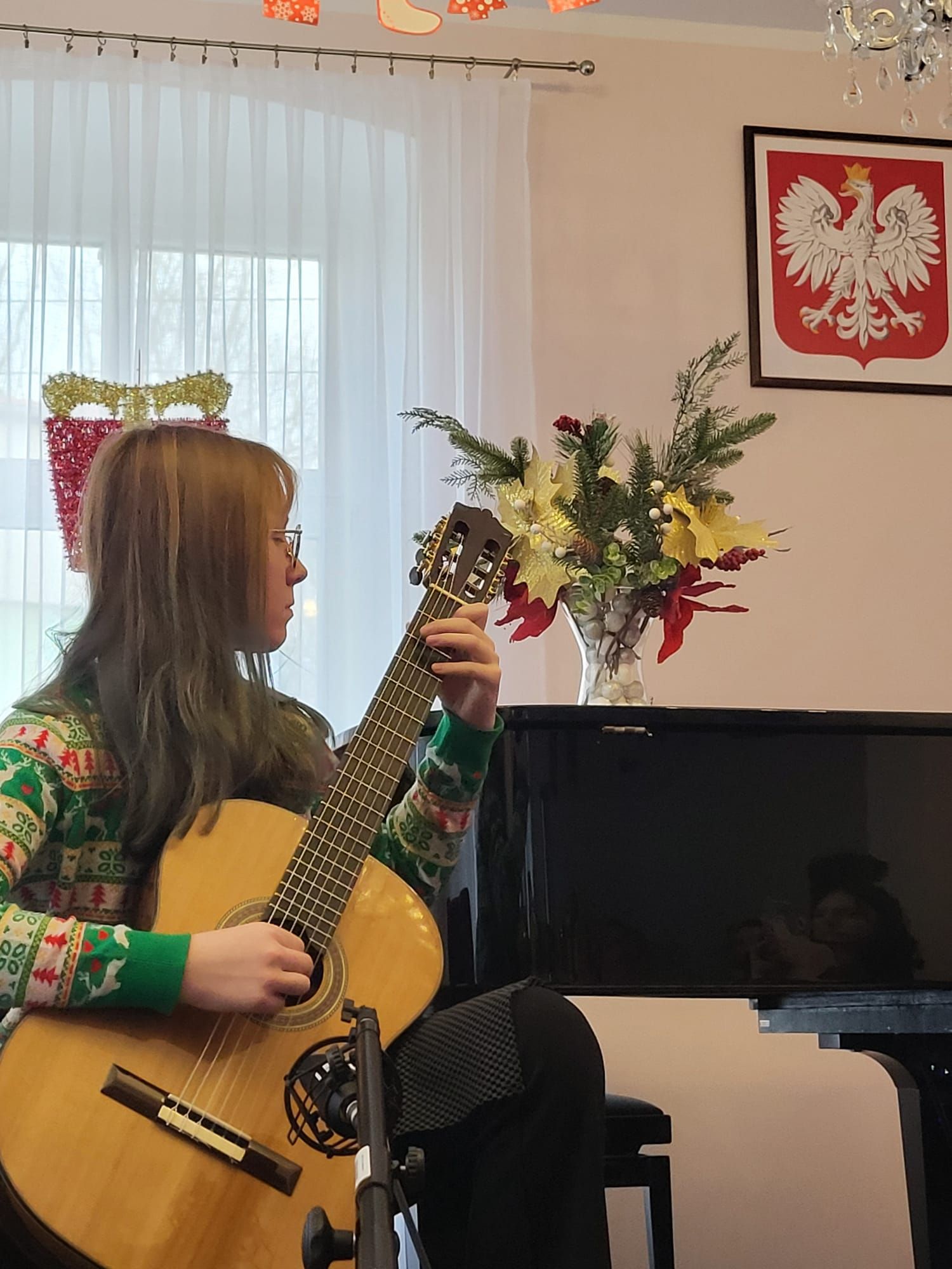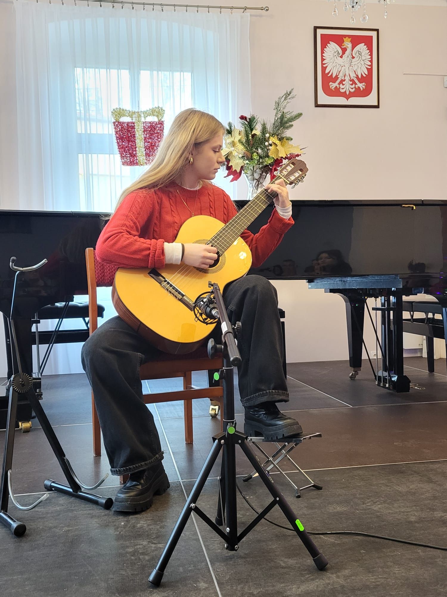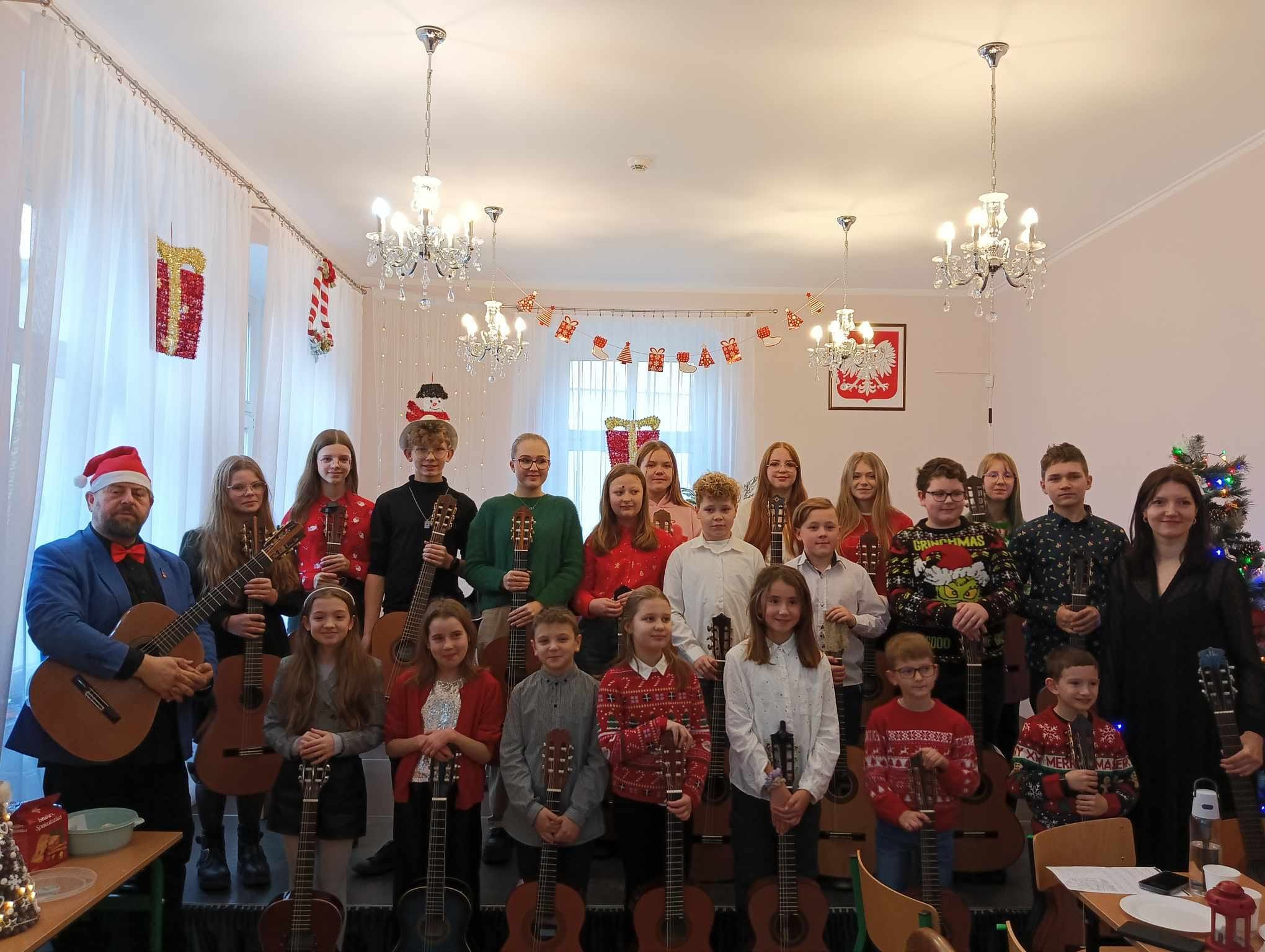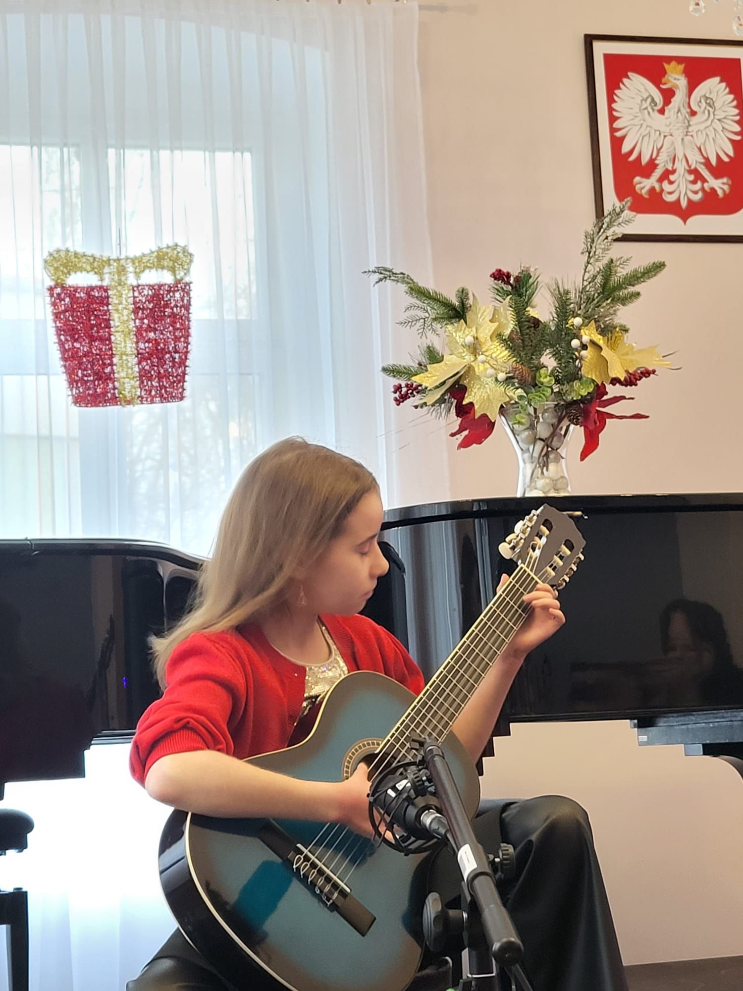 W sobotę 21.12.2024 o godz.12 w naszej szkole odbył się Gitarowy Koncert Kolęd, na którym wystąpili uczniowie p. Witolda Kozakowskiego i p. Joanny Nowackiej. Wszystkich przywitała p. dyr. Barbara Prasał składając świąteczno-noworoczne życzenia.
