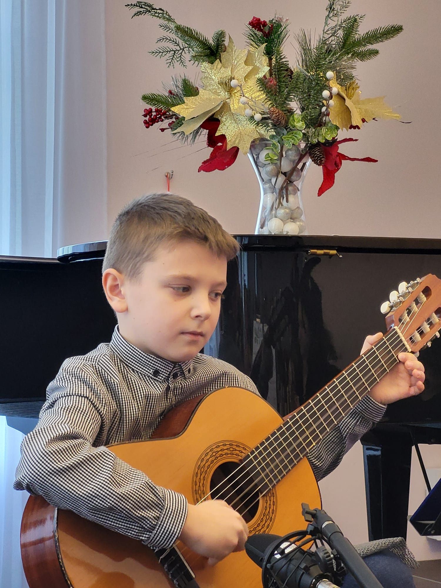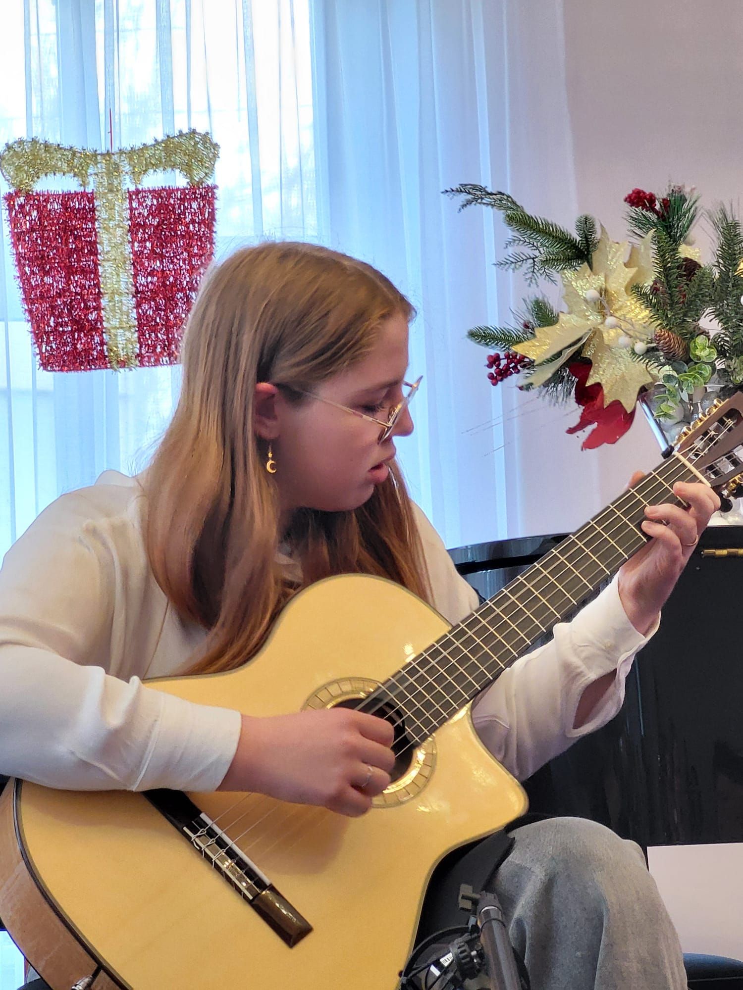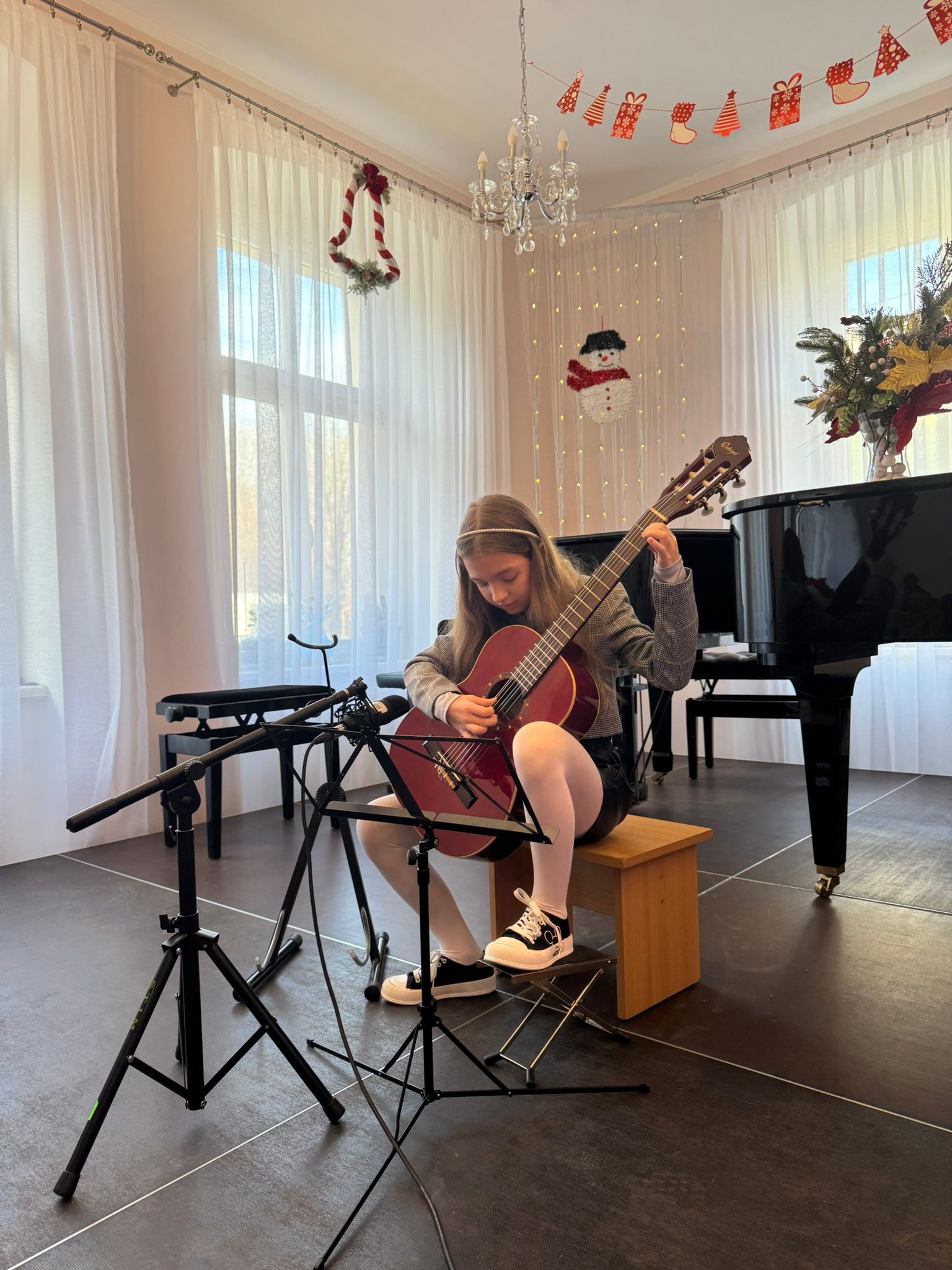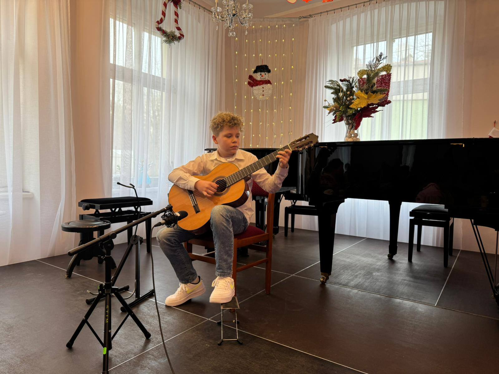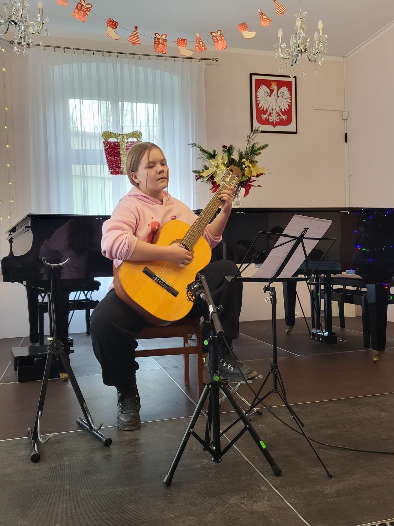 W sobotę 21.12.2024 o godz.12 w naszej szkole odbył się Gitarowy Koncert Kolęd, na którym wystąpili uczniowie p. Witolda Kozakowskiego i p. Joanny Nowackiej. Wszystkich przywitała p. dyr. Barbara Prasał składając świąteczno-noworoczne życzenia.
