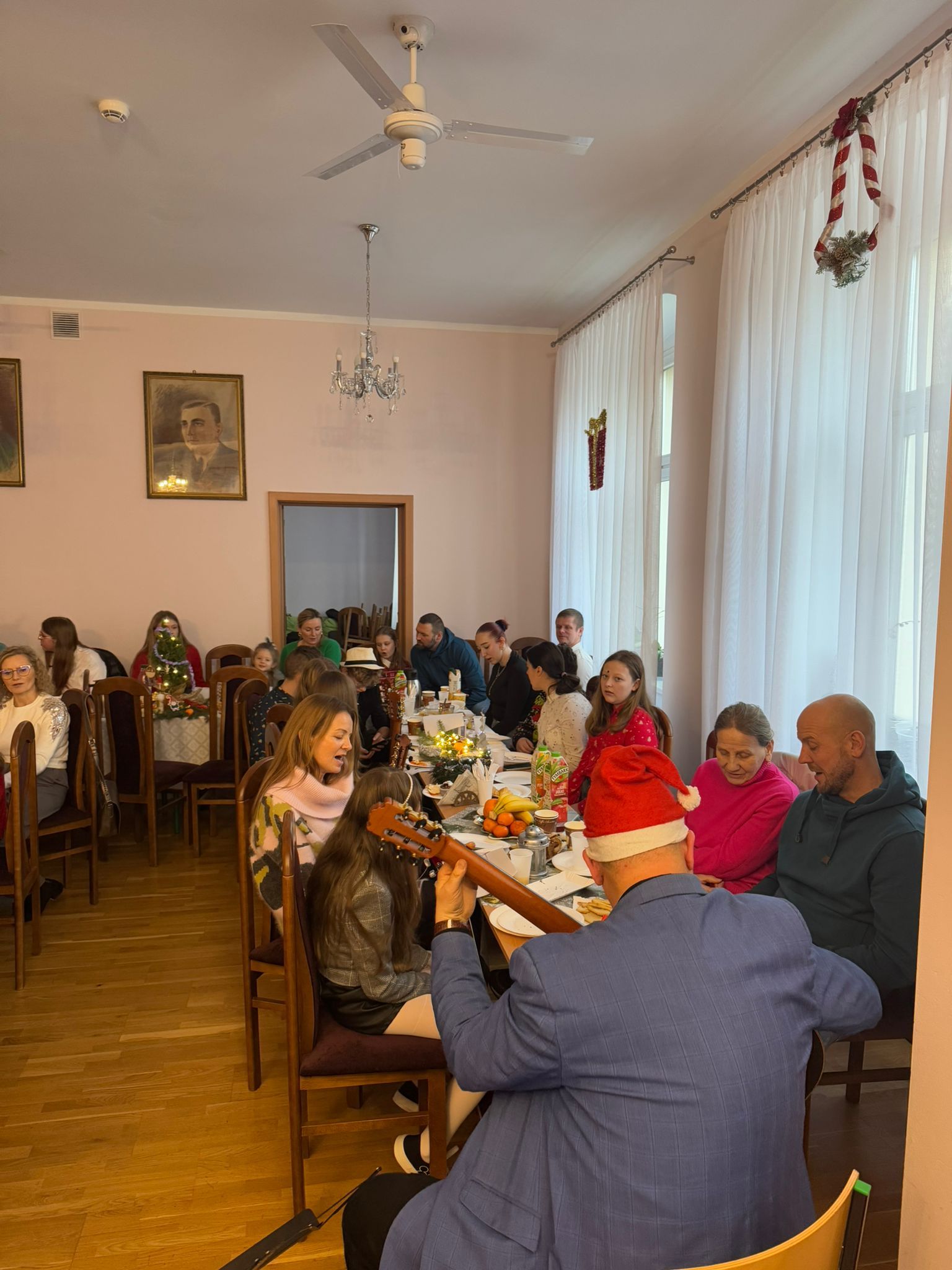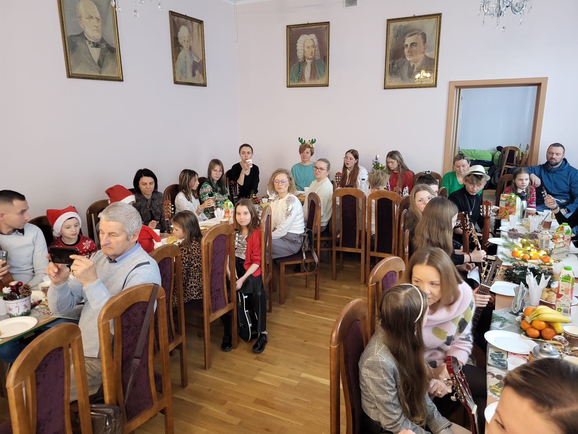 A później, przy smacznym świątecznym poczęstunku, gitarzyści zaprezentowali kolędy, pastorałki i melodie związane z Bożym Narodzeniem w ciekawych aranżacjach i interpretacjach. Na koniec wszyscy występujący oraz słuchacze zaśpiewali wspólnie kilka kolęd. Oprócz brzmienia gitary usłyszeliśmy dodatkowo jeszcze saksofon i fortepian.