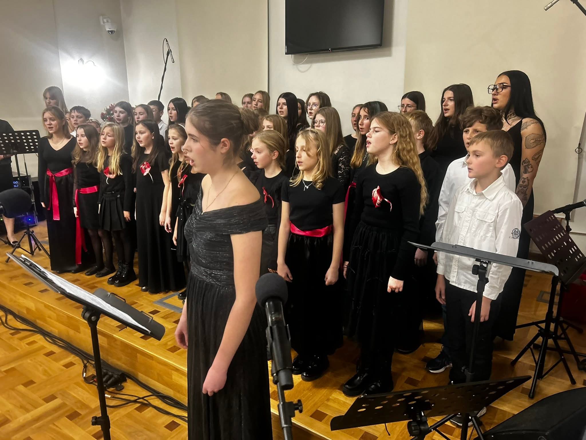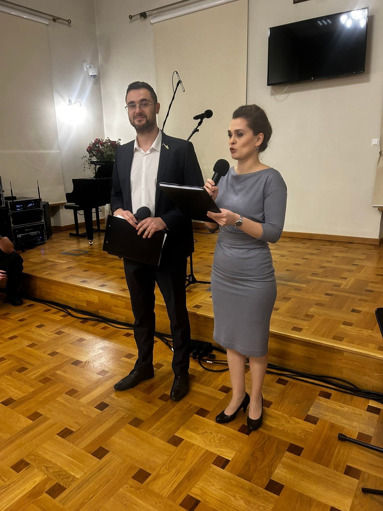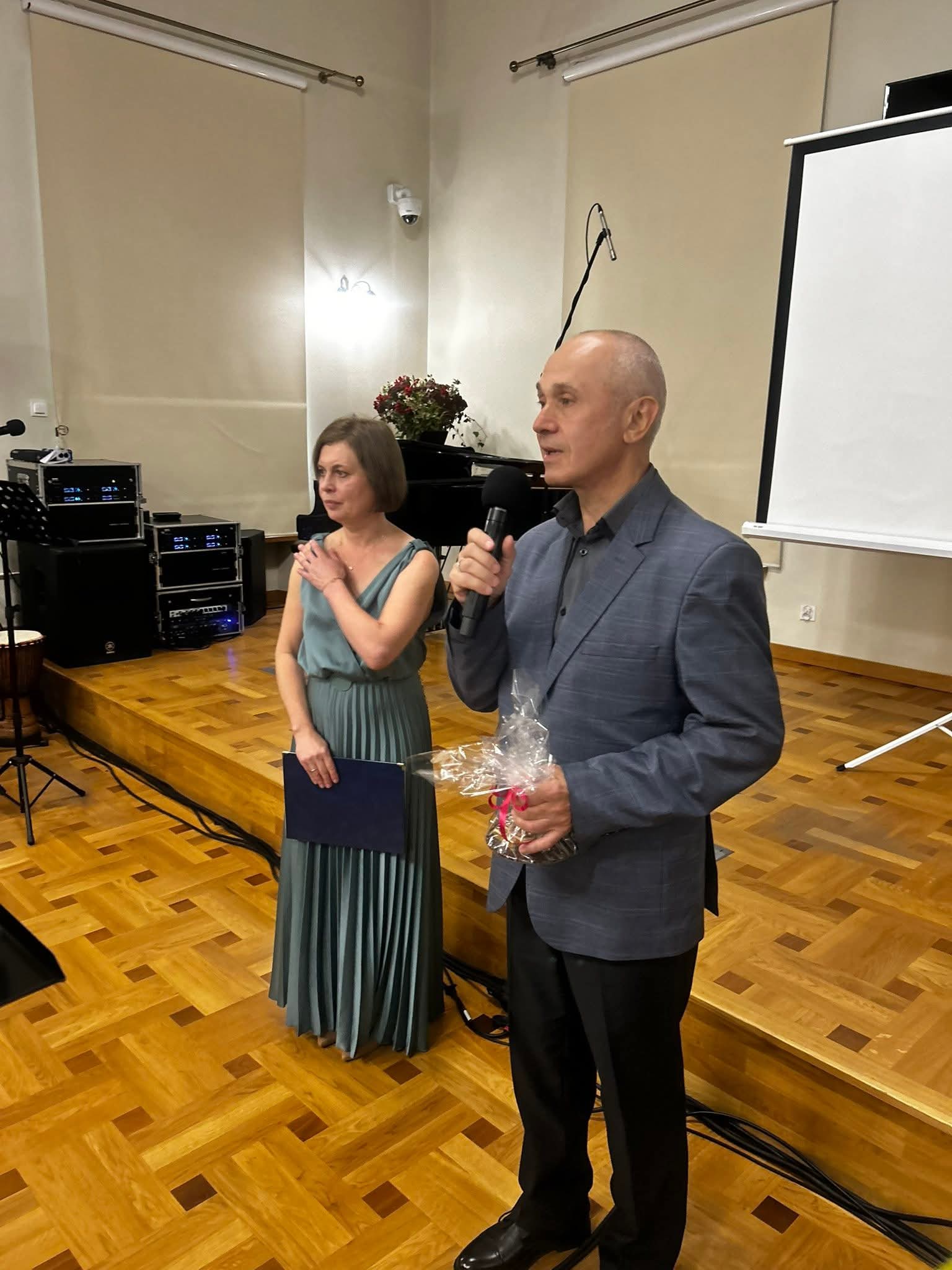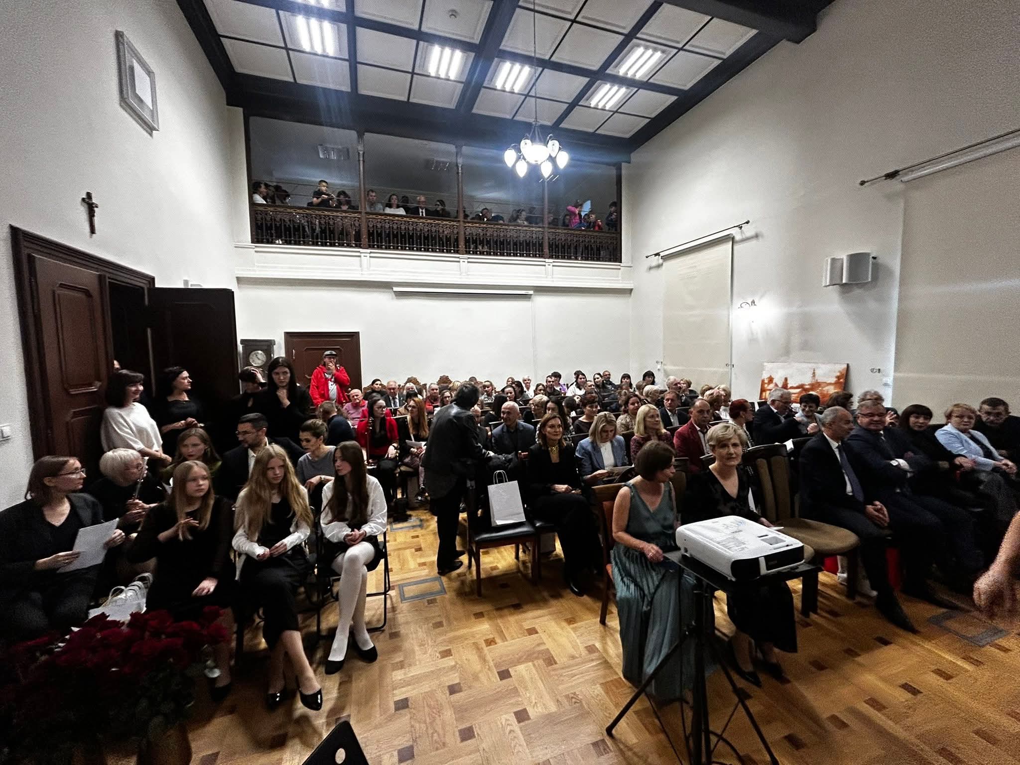 Zanim rozpoczął się jubileuszowy koncert, zgromadzeni obejrzeli jeszcze krótki film prezentujący historię i bieżącą działalność szkoły, w którym w roli lektorów wystąpili absolwenci: pan Bogdan Dmowski (rocznik 1971 i 1975) i Zuzanna Choińska (rocznik 2025).