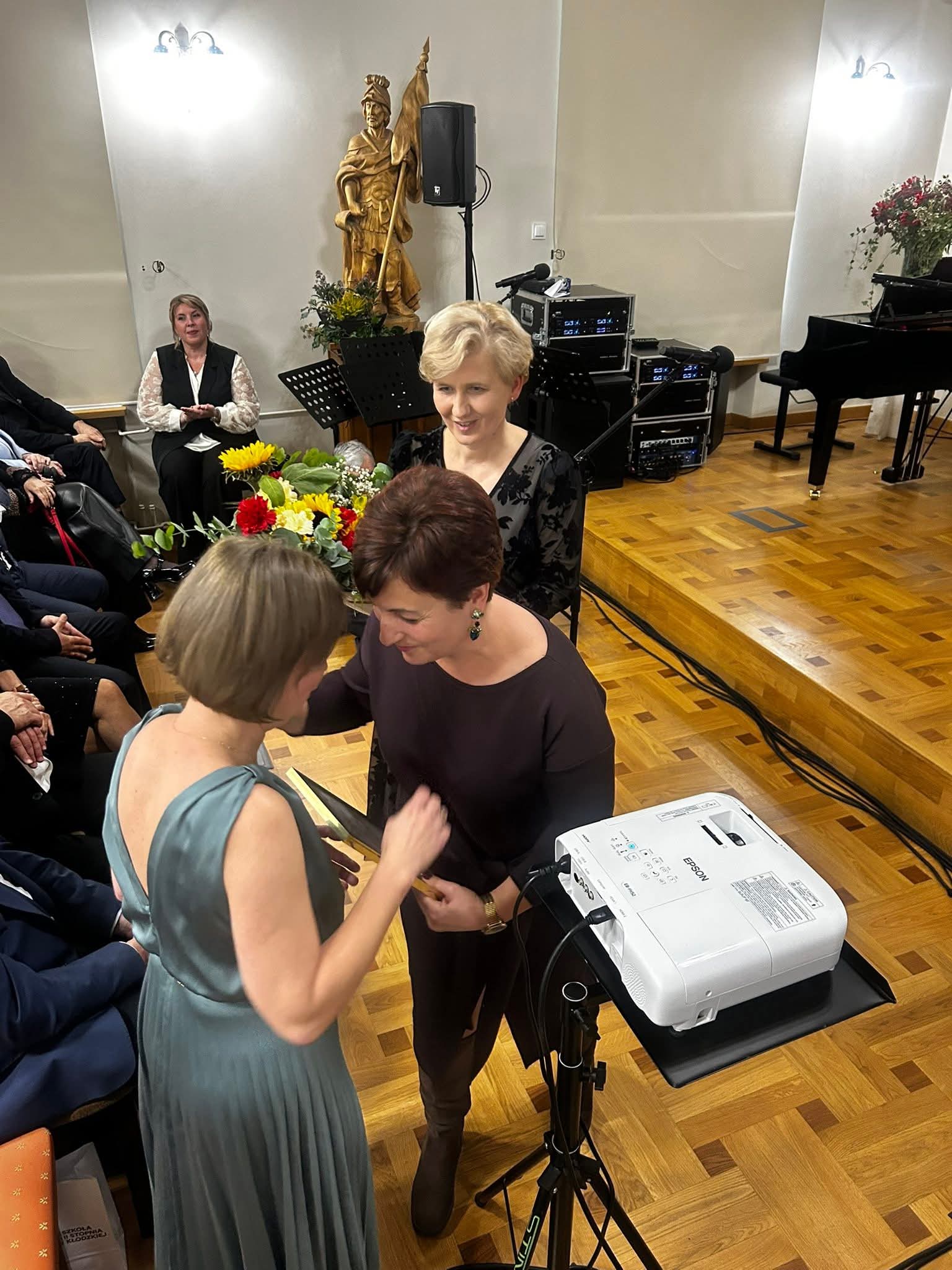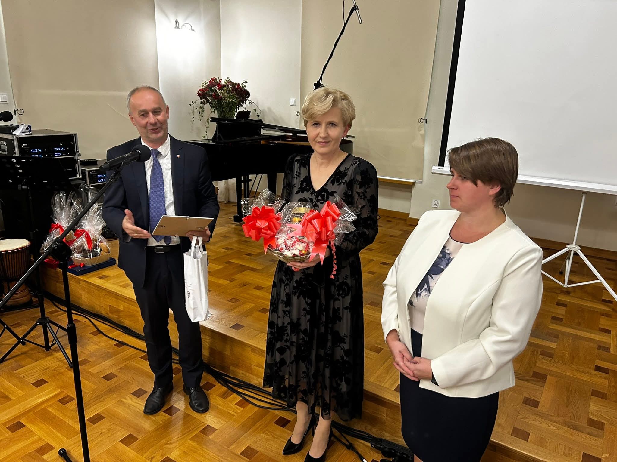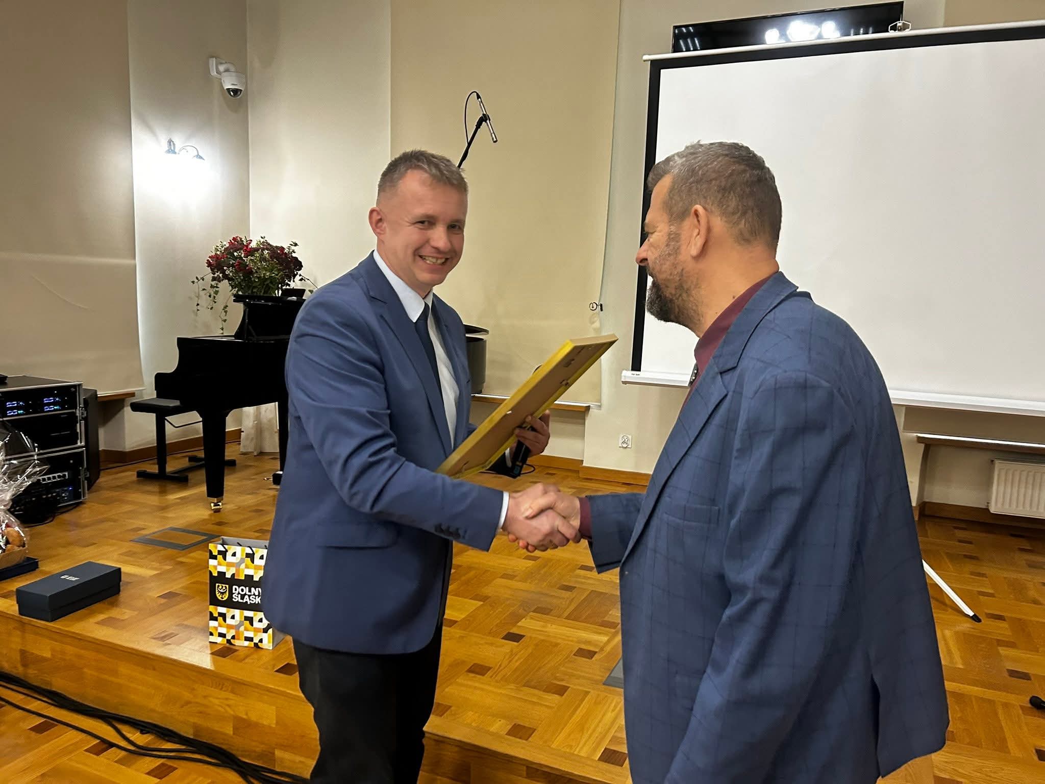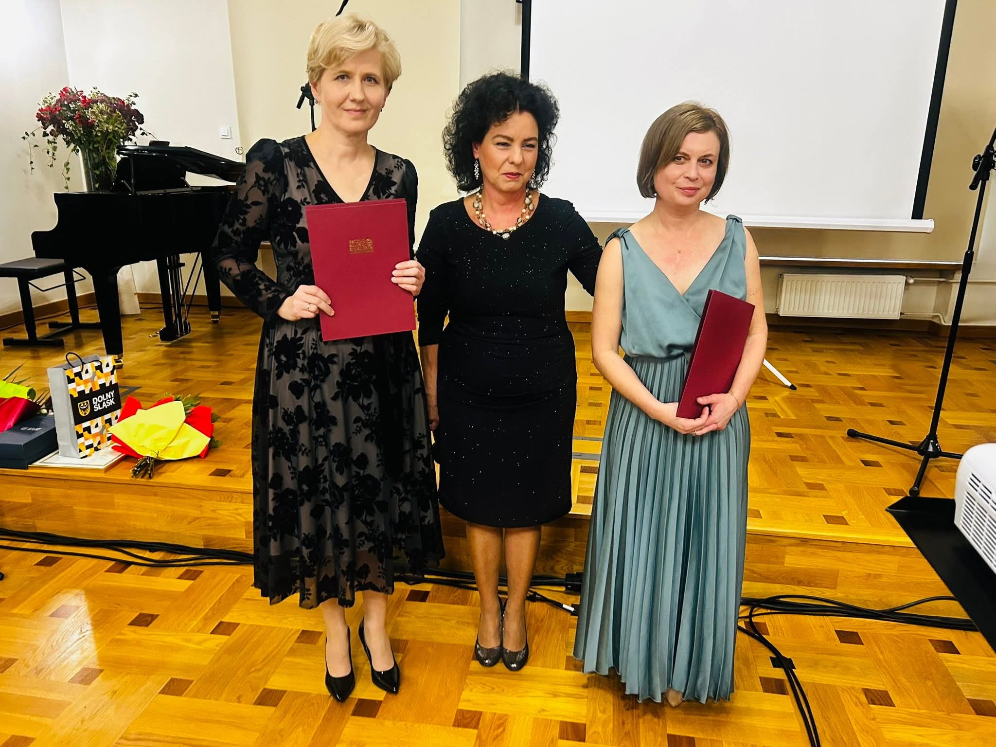 W części oficjalnej zaproszeni goście składali gratulacje dyrekcji oraz całej społeczności szkolnej. Pani dyrektor Barbara Prasał i pani wicedyrektor Renata Fiałkowska-Duma odebrały z rąk pani wizytator Małgorzaty Panek-Kiszczak nagrody indywidualne II stopnia Dyrektora CEA. Pan Witold Kozakowski wyróżniony został z kolei nagrodą Marszałka Województwa Dolnośląskiego, którą podczas uroczystości przekazał mu pan Adam Jaśnikowski. Pani dyrektor wręczyła kwiaty i jubileuszowe upominki swojej poprzedniczce – pani Aleksandrze Tarchale, a pani wicedyrektor uhonorowała absolwentów z wczesnych lat działalności placówki, którzy zawodowo bądź amatorsko związali się z muzyką. Medaliony z lirą – wieloletnim symbolem szkoły otrzymali: pani Małgorzata Panek-Kiszczak, pan Jan Ostapowicz, pani dr Iwona Polak, pani Elżbieta Kubicz, pan Stanisław Tarchała, pani Małgorzata Przywara i pan Marek Piotrowski. Podczas uroczystości wybrani nauczyciele oraz pracownicy administracji i obsługi odebrali również nagrody dyrektora szkoły.