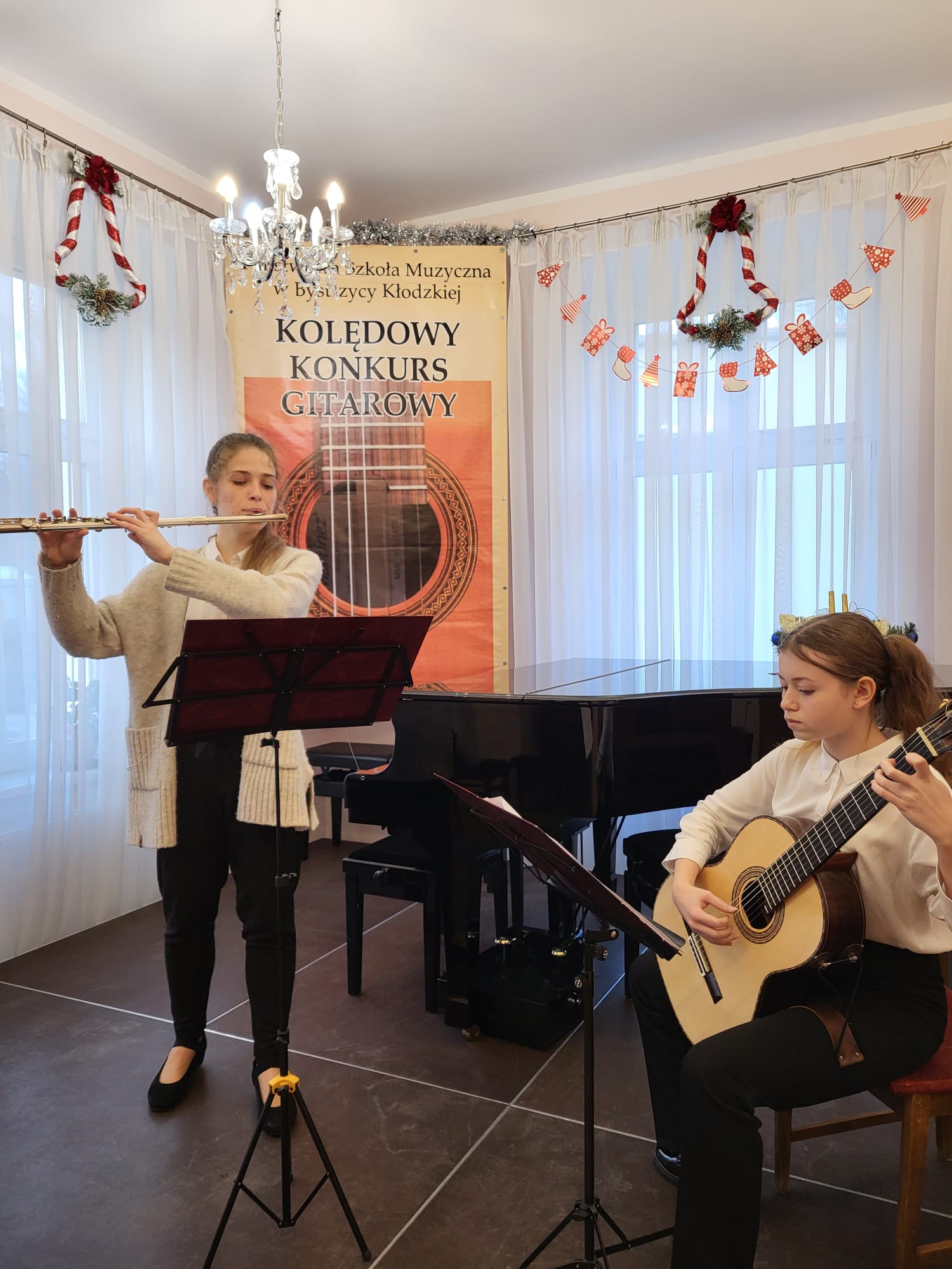 W sobotę 14 stycznia br. w naszej szkole rozbrzmiewały dźwięki kolęd i pastorałek za sprawą zorganizowanego przez naszą szkołę Ogólnopolskiego Kolędowego Konkursu Gitarowego. Już po raz ósmy do Bystrzycy Kłodzkiej zjechali się młodzi gitarzyści, aby wystąpić na scenie z repertuarem kolędowym. Oprócz solistów w konkursie wzięły też udział zespoły kameralne. W zmaganiach o laury bardzo dobrze zaprezentowali się uczniowie naszej szkoły: GitDuo (Hanna Grudzień, Karol Gwizdak) - wyróżnienie, solistka Lila Wyjadłowska - III miejsce, duet fletowo-gitarowy (Magdalena Dworzańska - flet, Lila Wyjadłowska - gitara) zdobył III miejsce, a Duet "Łap Duo", w którym gra nasza uczennics Małgorzata Łapińska, otrzymał pozaregulaminowe wyróżnienie za " kultywowanie rodzinnego muzykowania". Prezentacje uczestników konkursu oceniało wymagające jury: dr Bartłomiej Marusik - przewodniczący, dr Anna Pietrzak, wirtioz Piotr "Restek" Restecki. Gratulujemy uczniom, ich rodzicom i nauczycielowi Witoldowi Kozakowskiemu za dobre przygotowanie uczniów do konkursu.