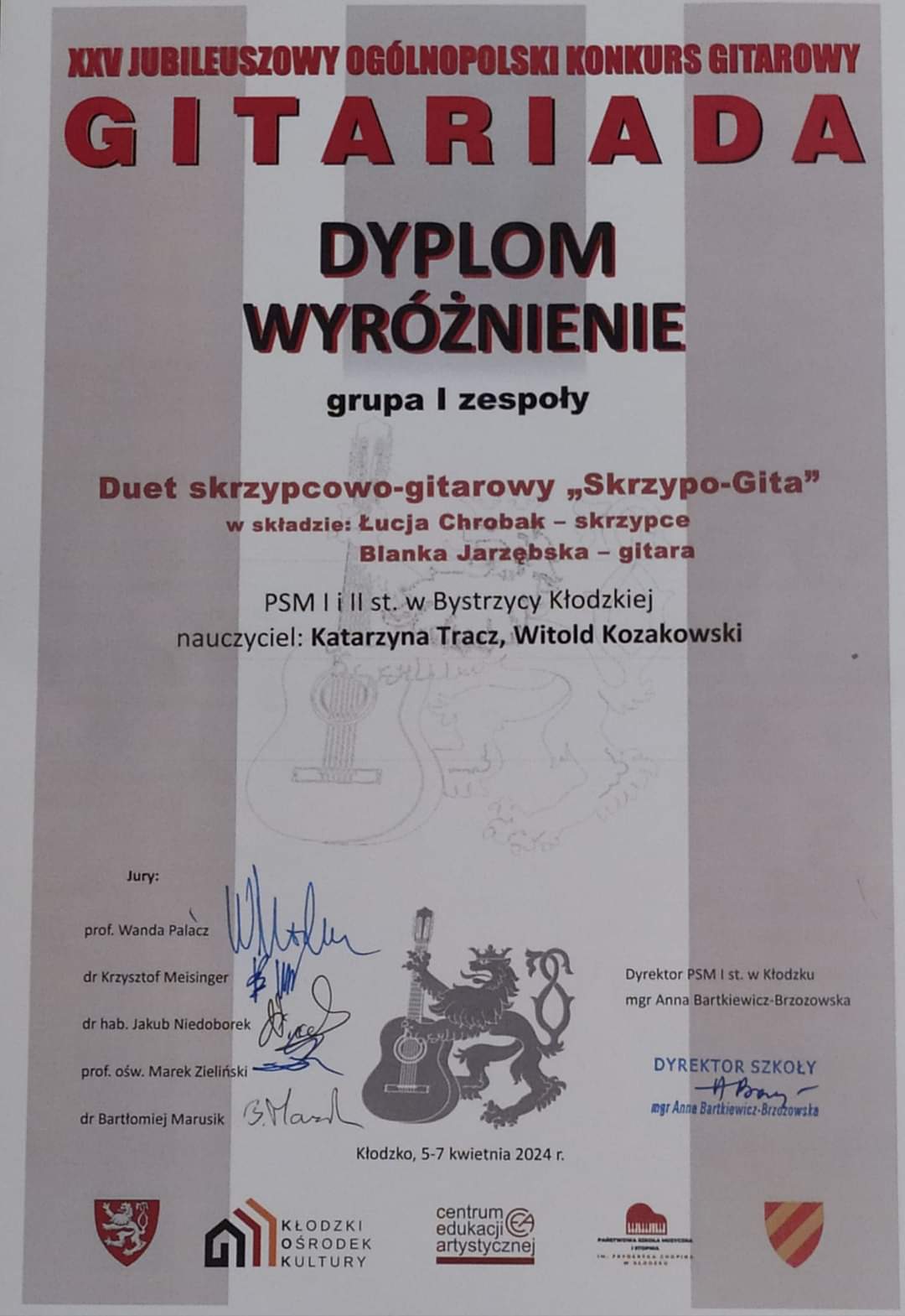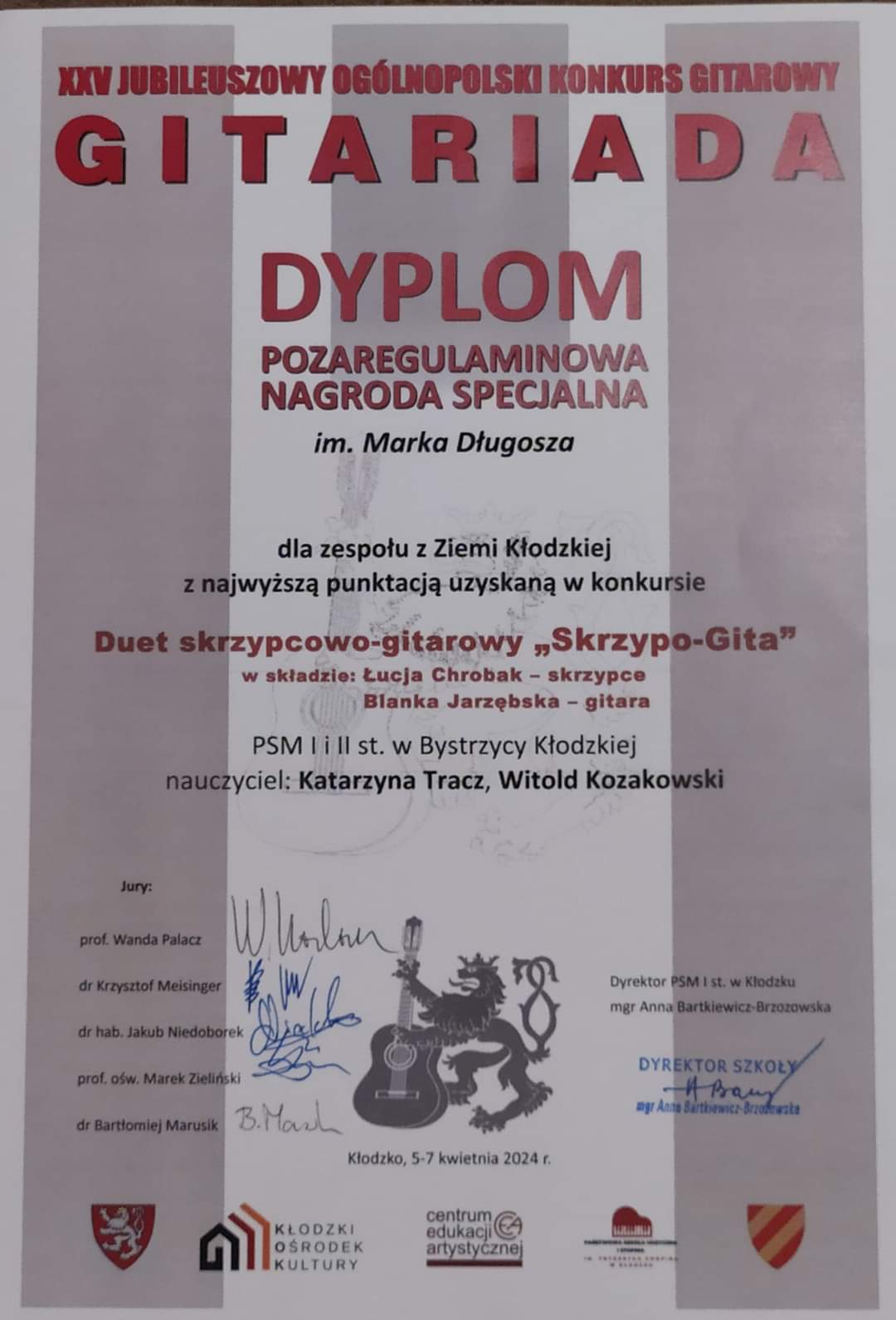 Z przyjemnością informujemy, że duet skrzypcowo-gitarowy "Skrzypo-Gita" w składzie Łucja Chrobak, Blanka Jarzębska na XXV jubileuszowym konkursie "Gitariada" w Kłodzku otrzymał Wyróżnienie oraz Pozaregulaminową Nagrodę Specjalną im. Marka Długosza. Serdecznie gratulujemy dziewczynkom oraz nauczycielom: Witoldowi Kozakowskiemu i Katarzynie Tracz, jak również życzymy kolejnych, pięknych sukcesów!
