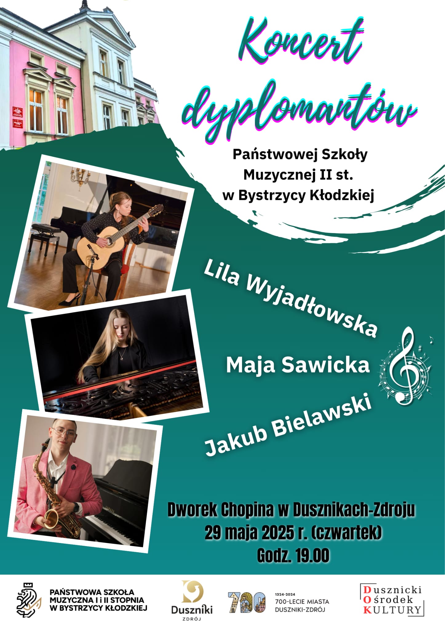 Dziś 29 maja odbył się koncert w Dworku Chopina w Dusznikach-Zdroju, w którym wzięli udział dyplomanci: Jakub Bielawski - saksofon, Lila Wyjadłowska - gitara i Maja Sawicka - fortepian. Publiczność przyjęła naszych młodych artystów ze szczerym entuzjazmem. Koncert był próbą generalną przed recitalami dyplomowymi, na które gorąco zapraszamy w przyszłym tygodniu. Gratulujemy wykonawcom udanych występów i życzymy powodzenia podczas recitali dyplomowych!