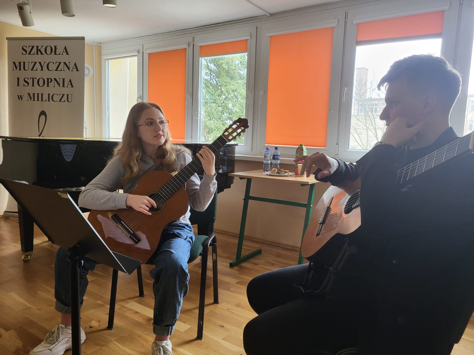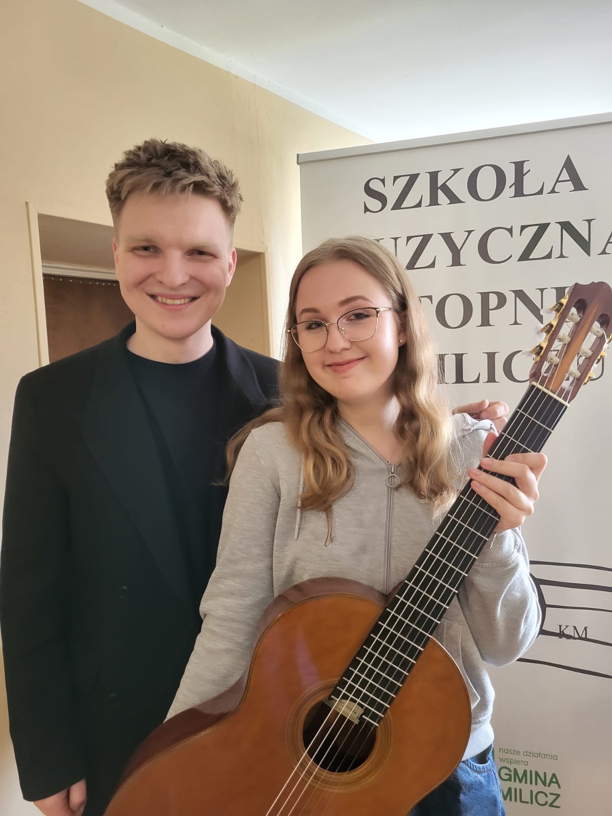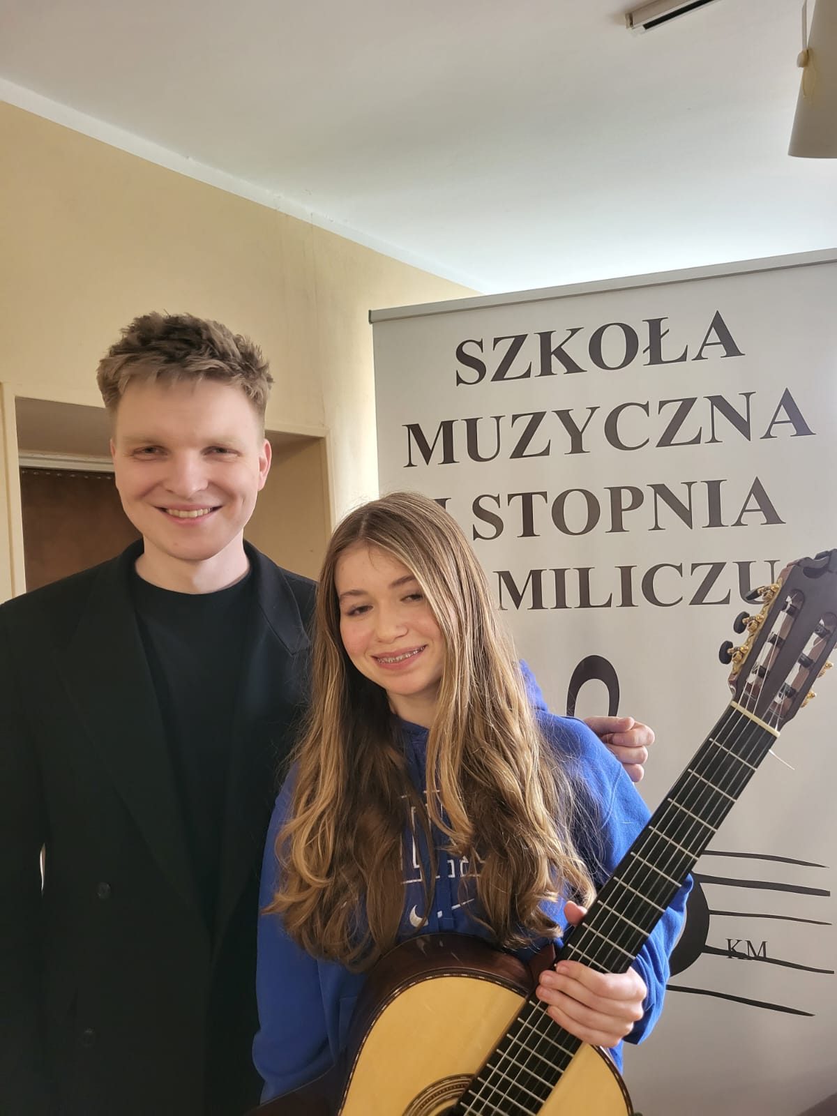 W dniu 18.03.2024 r. uczennice naszej szkoły z klasy gitary Witolda Kozakowskiego: Lila Wyjadłowska i Małgorzata Łapińska wzięły udział w lekcjach mistrzowskich prowadzonych przez Mateusza Kowalskiego - wybitnego wirtuoza gry na gitarze związanego z Uniwerystetem Muzycznym im. Fryderyka Chopina w Warszawie. Zajęcia zrealizowane zostały w Szkole Muzycznej I st. w Miliczu ramach VII Maratonu Gitarowego "Gitaraton". Gratulacje za aktywność.