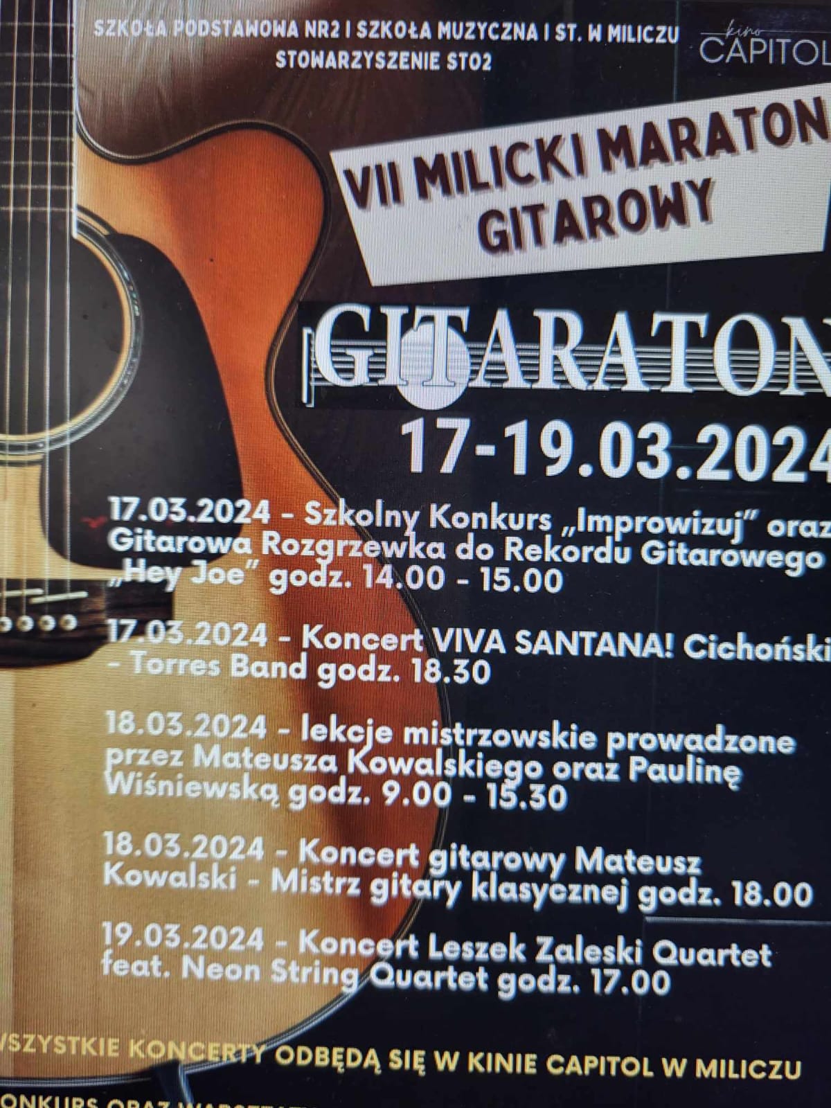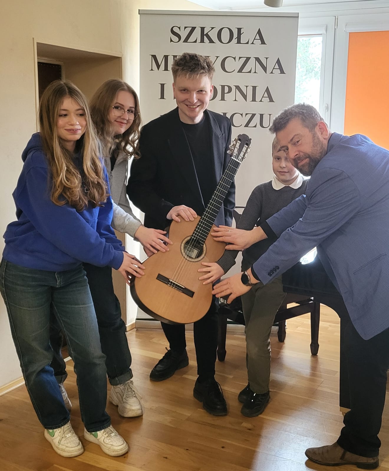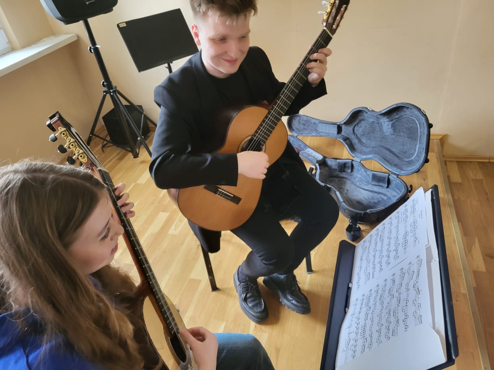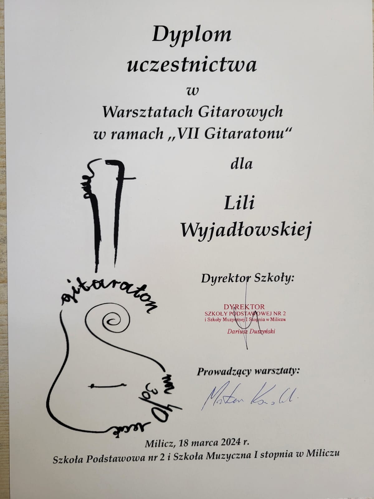 W dniu 18.03.2024 r. uczennice naszej szkoły z klasy gitary Witolda Kozakowskiego: Lila Wyjadłowska i Małgorzata Łapińska wzięły udział w lekcjach mistrzowskich prowadzonych przez Mateusza Kowalskiego - wybitnego wirtuoza gry na gitarze związanego z Uniwerystetem Muzycznym im. Fryderyka Chopina w Warszawie. Zajęcia zrealizowane zostały w Szkole Muzycznej I st. w Miliczu ramach VII Maratonu Gitarowego "Gitaraton". Gratulacje za aktywność.