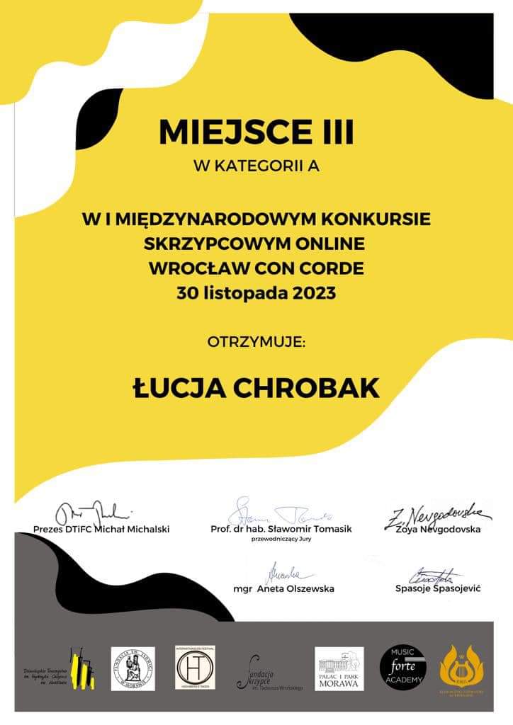 Miło nam poinformować, że Łucja Chrobak, uczennica klasy skrzypiec pani Katarzyny Tracz, zajęła III miejsce na I Międzynarodowym Konkursie Skrzypcowym online - Wrocław Con Corde. Łucji akompaniowała pani Elżbieta Malinowska. Serdecznie gratulujemy i życzymy dalszych sukcesów!