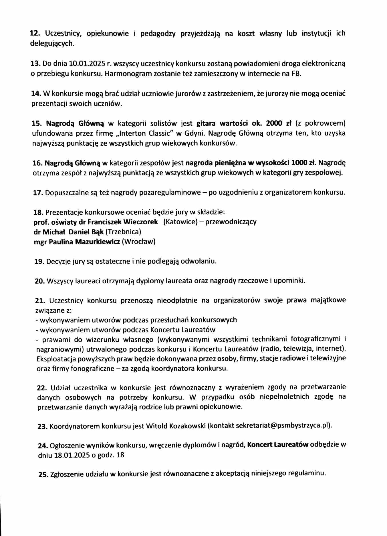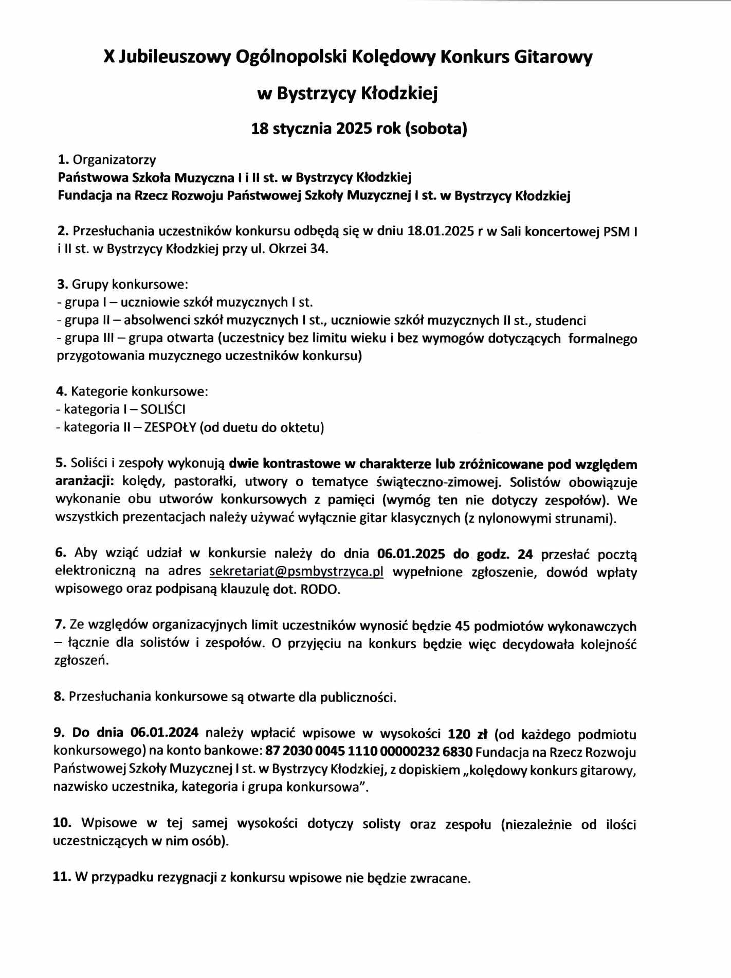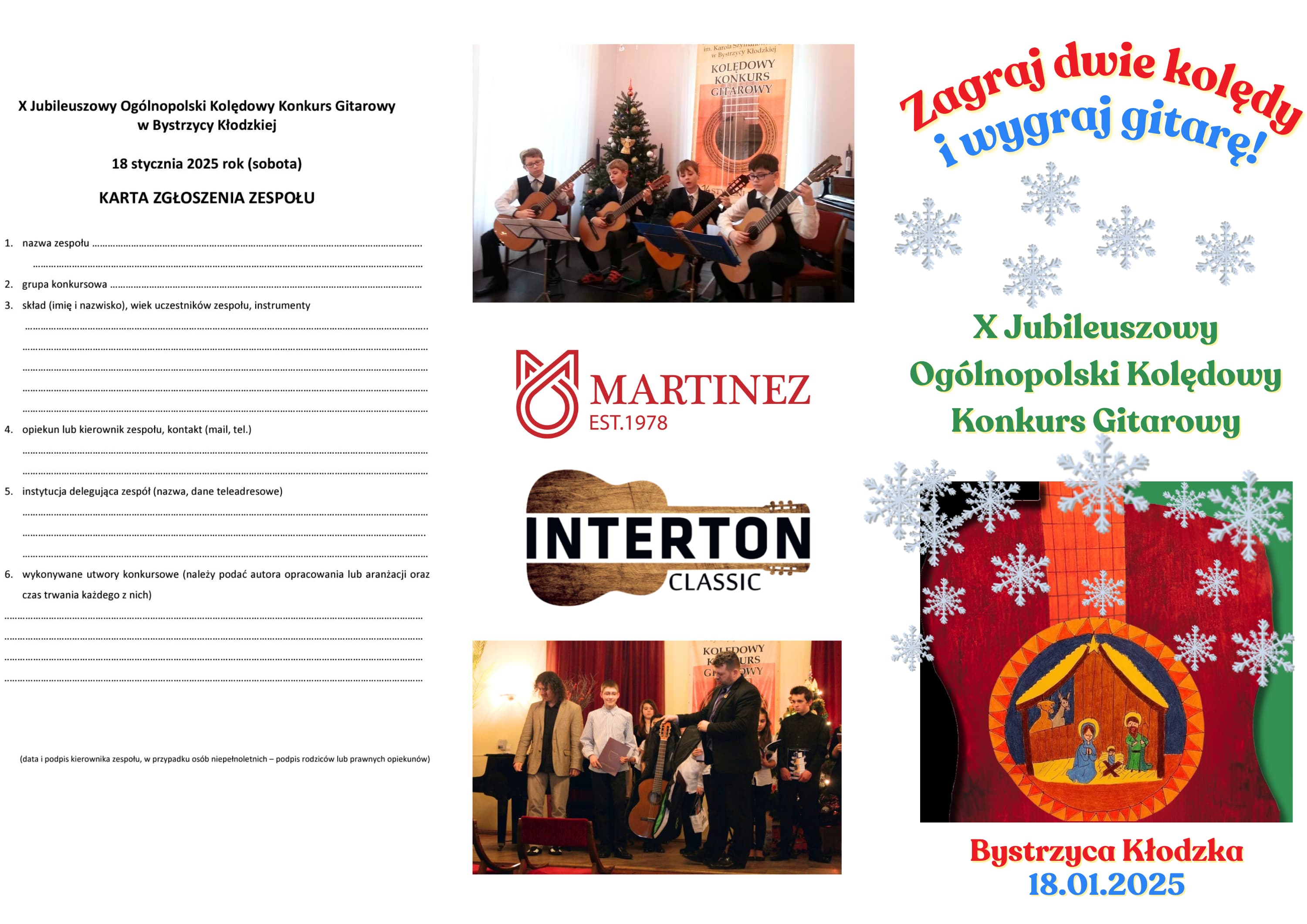 Przyjedź w sobotę 18 stycznia 2025 roku do Bystrzycy Kłodzkiej, zagraj dwie kolędy i... wygraj gitarę! A jeśli masz zespół gitar klasycznych lub kameralny z udziałem gitary klasycznej - wygraj 1000 zł!