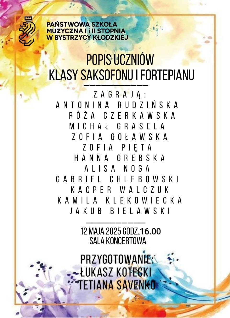 W poniedziałek 12 maja 2025 r. w naszej szkole odbył sie popis klasy saksofonu Pana Łukasza Koteckiego oraz klasy fortepianu Pani Tetiany Savenko. Wszystkim uczestnikom gratulujemy i zapraszamy na kolejne koncerty.