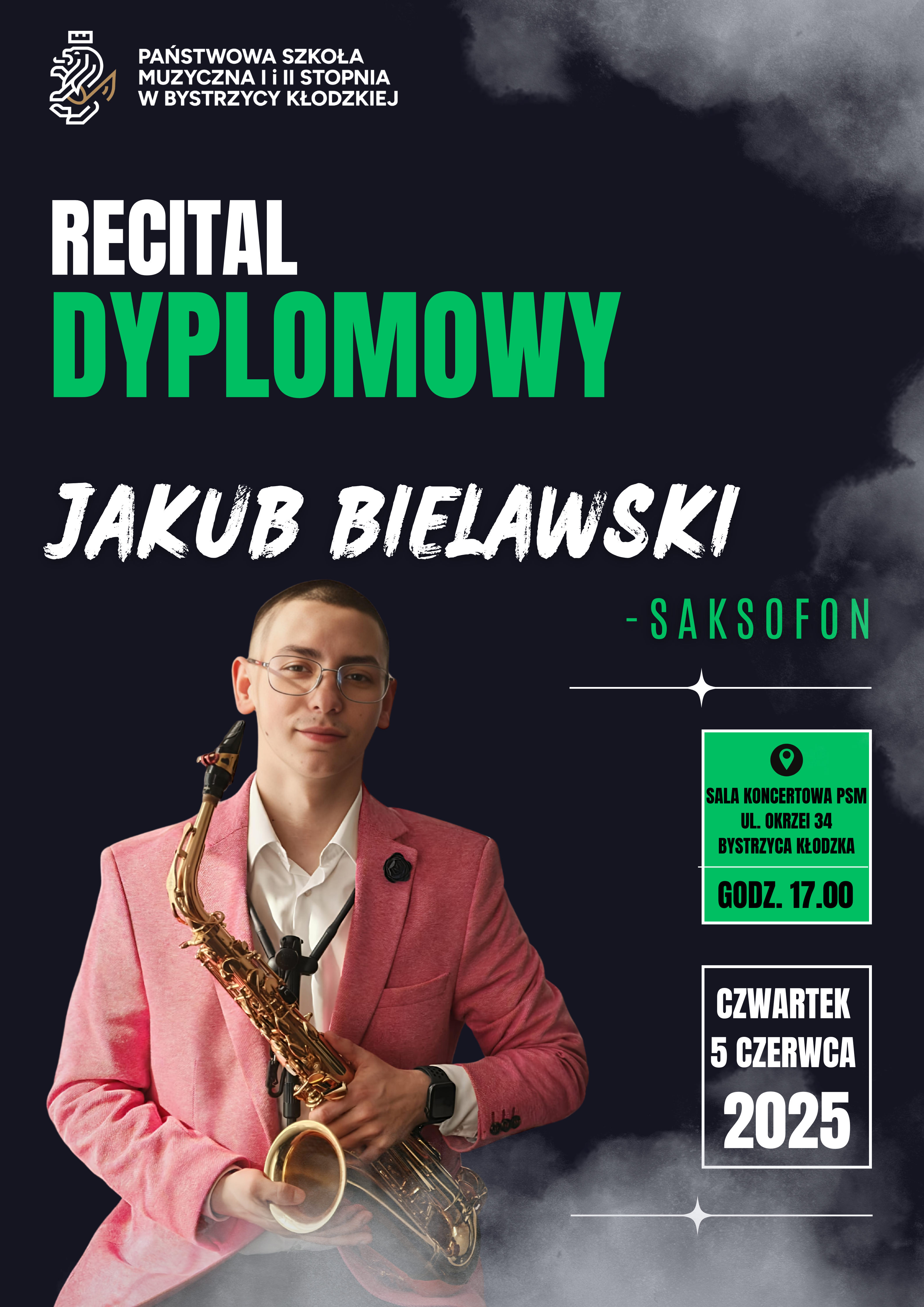5.06.2025 odbył się recital dyplomowy Jakuba Bielawskiego z klasy saksofonu pana Łukasza Koteckiego. W programie znalazły się utwory: