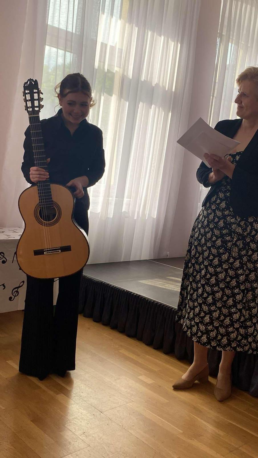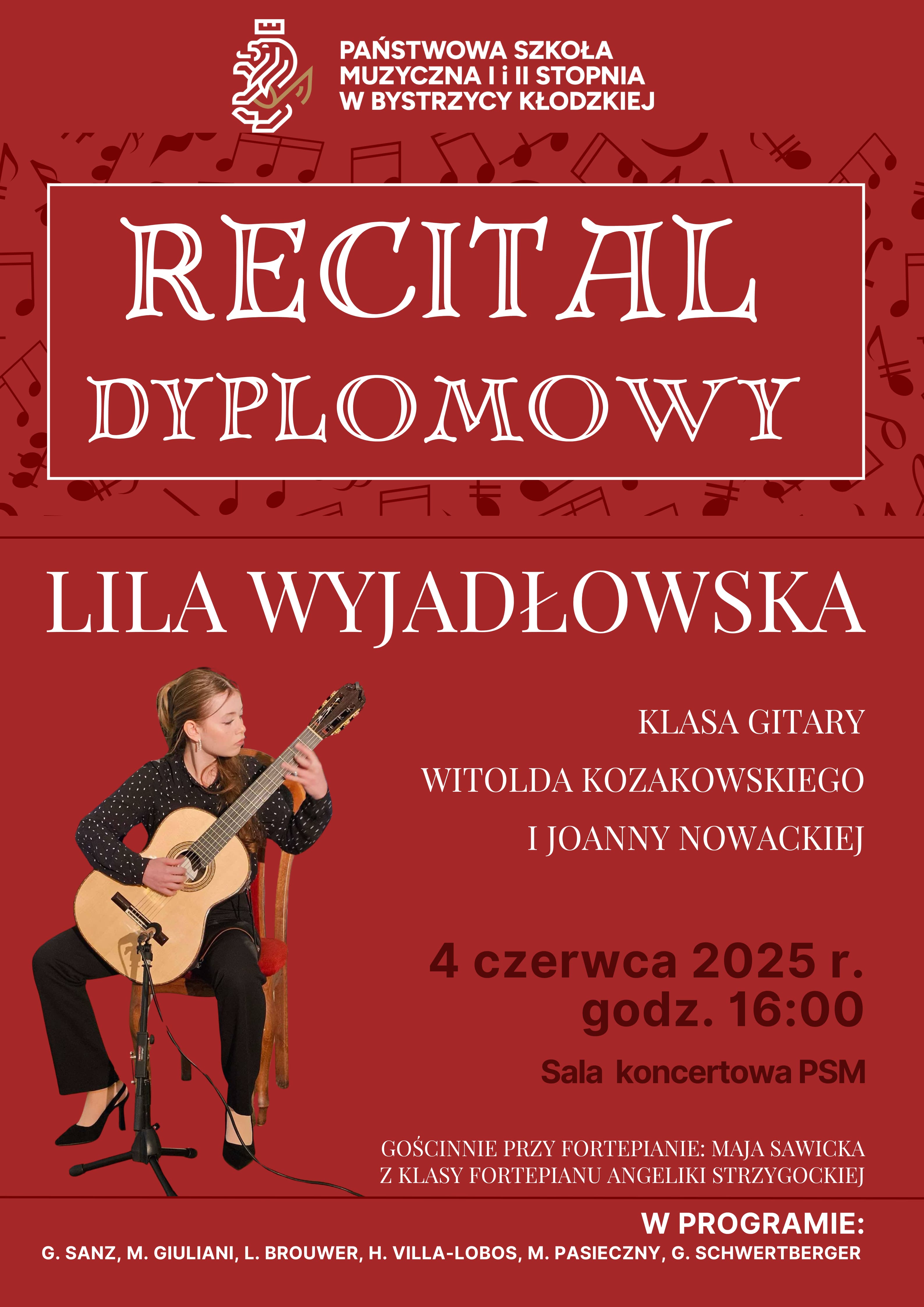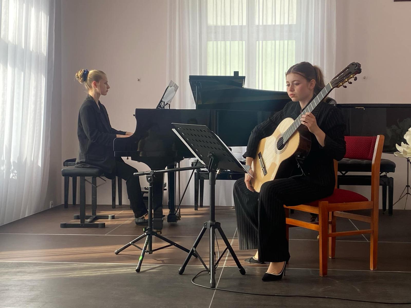 4 czerwca 2025 r. o godz. 16:00 odbył się recital dyplomowy naszej uczennicy klasy gitary szkoły II st. - Lili Wyjadłowskiej. Młoda gitarzystka zakończyła swoją naukę w naszej szkole w klasie p. Joanny Nowackiej, była również wieloletnią podopieczną p. Witolda Kozakowskiego. Koncert gitarowy solo został wzbogacony o duet fortepianowo-gitarowy przy współpracy z Mają Sawicką, tegoroczną dyplomantką w klasie fortepianu p. Angeliki Strzygockiej. Recital dostarczył wszystkim wielu emocji, a naszym dyplomantkom satysfakcji.