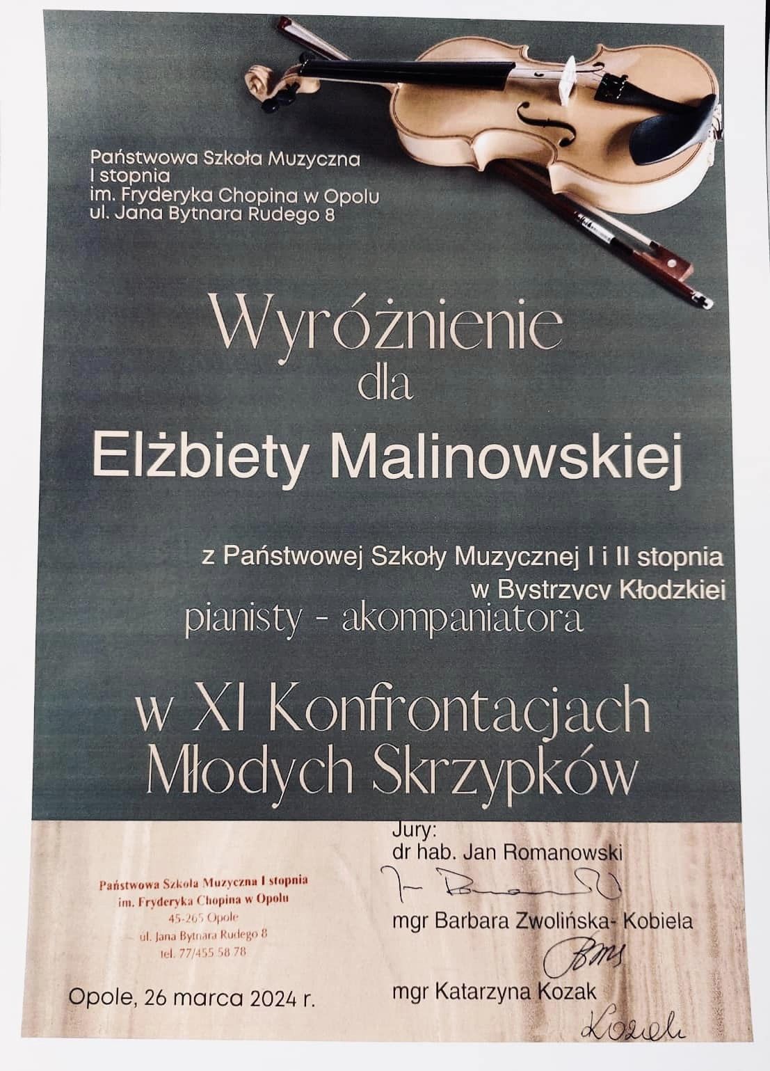 Nagrodzeni zostali także nasi nauczyciele, p. Elżbieta Malinowska otrzymała wyróżnienie dla pianisty - akompaniatora, a p. Katarzyna Tracz dyplom za wyróżniające przygotowanie ucznia.