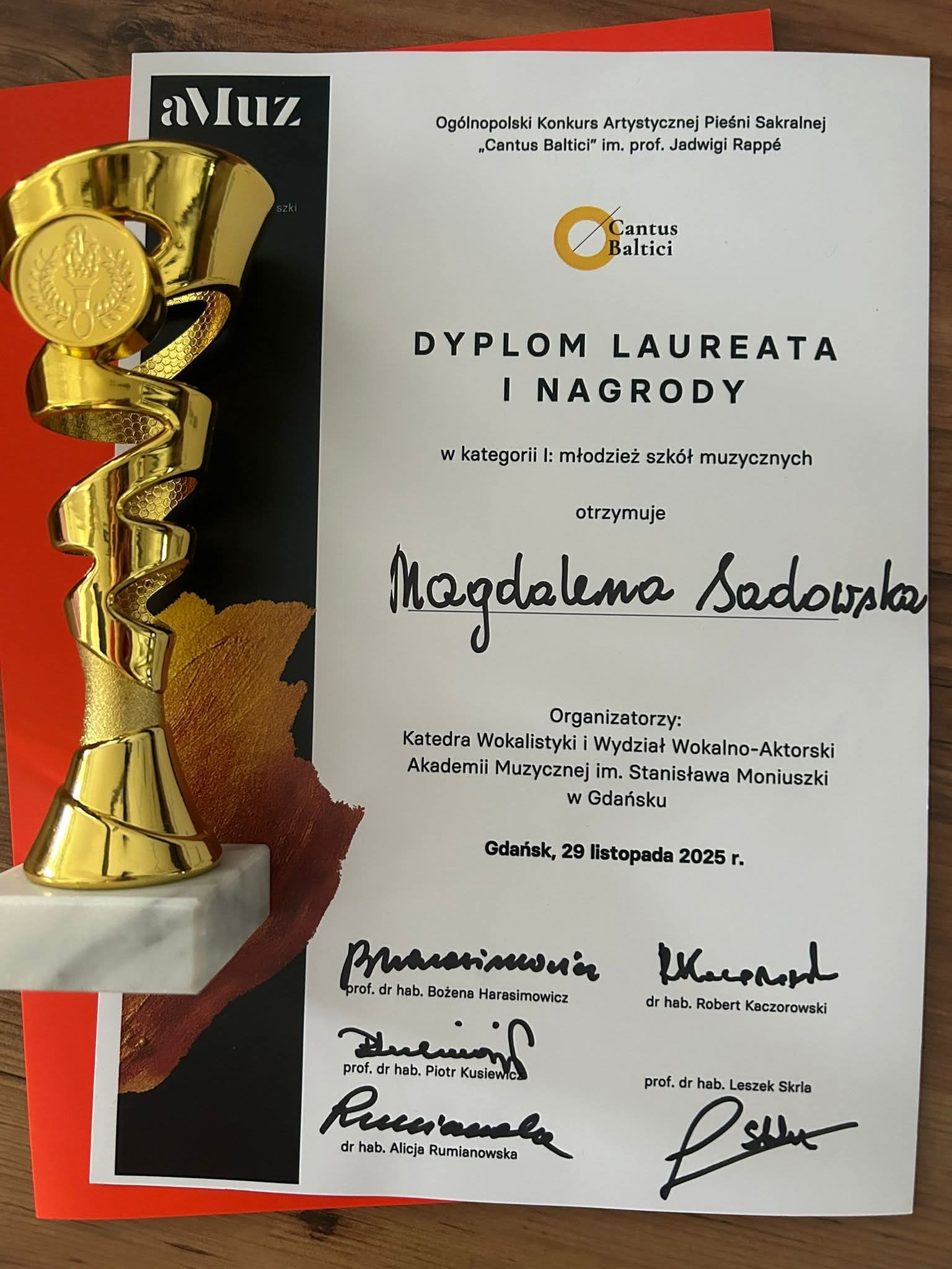 Z radością i dumą informujemy, że Magdalena Sadowska z klasy śpiewu pana Rafała Żurakowskiego zdobyła I nagrodę w kategorii: młodzież szkół muzycznych w Ogólnopolskim Konkursie Artystycznej Pieśni Sakralnej "Cantus Baltici" im. prof. Jadwigi Rappé. Konkurs zorganizowany został przez Katedrę Wokalistyki Akademii Muzycznej im. Stanisława Moniuszki w Gdańsku.