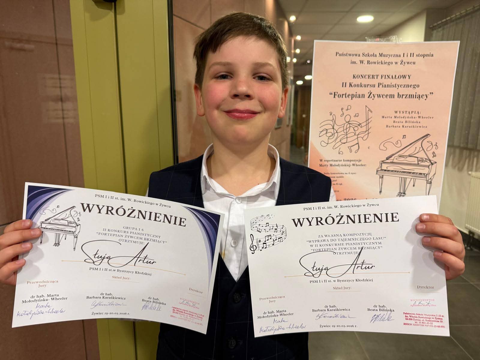 Zofia Pięta II/6 oraz Artur Słuja III/6 podczas konkursu, który odbył się 20 marca 2026 r., „Fortepian Żywcem brzmiący” w Żywcu otrzymali wyróżnienia.