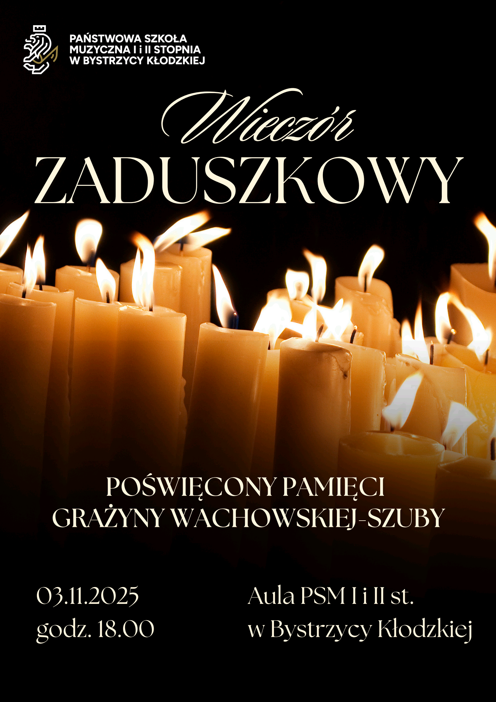 Zapraszamy serdecznie na Wieczór Zaduszkowy. Tegoroczny koncert poświęcony będzie pamięci Grażyny Wachowskiej-Szuby, która przez kilka lat była związana z naszą placówką - uczyła śpiewu i była wicedyrektorem w Szkole Muzycznej II st. Jak powszechnie wiadomo, przez długi czas współtworzyła życie kulturalne Bystrzycy Kłodzkiej, pełniąc funkcję dyrektora Miejsko-Gminnego Ośrodka Kultury. Jako osoba pełna pasji i charyzmy wykształciła grono uczniów, którzy dzięki Jej inspiracji kroczą artystyczną drogą.