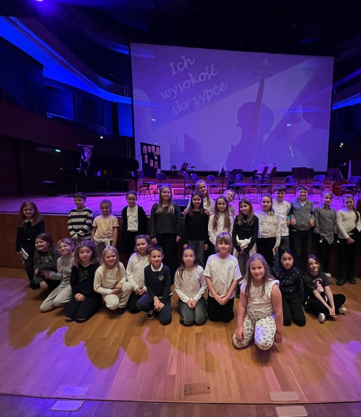 Dzisiaj (27.10.2025) nasi najmłodsi uczniowie pod opieką pani Renaty Fiałkowskiej-Dumy i pani Agnieszki Dubik uczestniczyli w audycji muzycznej "Ich wysokość skrzypce" w Narodowym Forum Muzyki we Wrocławiu. Podczas koncertu dzieci dowiedziały się, jak powstały instrumenty smyczkowe, a także kto to jest lutnik. Odkryły, który z instrumentów brzmi njwyżej, a który najniżej oraz dlaczego i co jest źródłem dźwięku w instrumencie smyczkowym. Wykonawcami koncertu była orkiestra Leopoldinum pod kierownictwem Christiana Danowicza, a całość poprowadził Michał Giersztof.