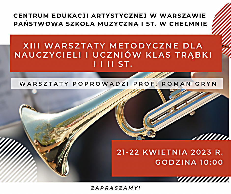 Serdecznie zapraszamy nauczycieli i uczniów klas trąbki (szkół muzycznych I i II stopnia) na Warsztaty Metodyczne prowadzone przez prof. Romana Grynia. PSM I stopnia w Chełmnie - 21-22.04.2023 r. godz. 10.00