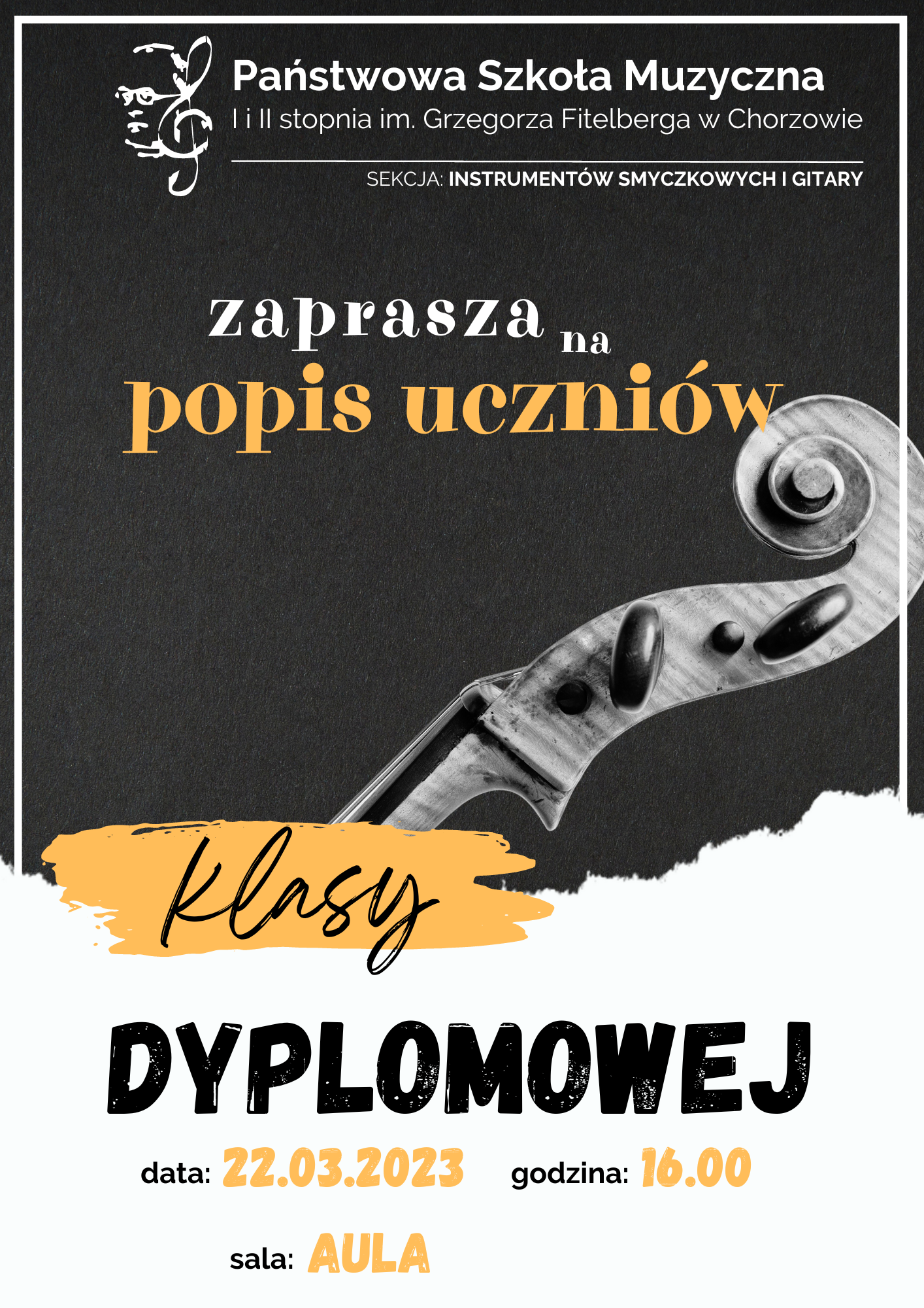 Plakat w kolorze szaro-białym, przedstawiający główkę skrzypiec, ze szczegółową informacją dotyczącą popisu uczniów klasy dyplomowej (data 22 marca 2023 roku, godzina 16:00, sala Aula)