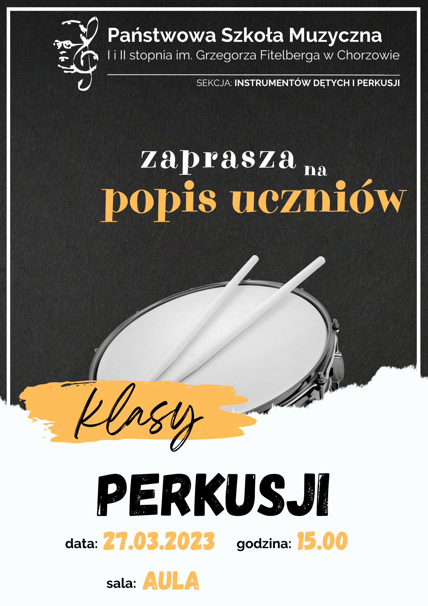 Wystąpią uczniowie klasy perkusji mgr Anny Famuły-Galwas, mgr Michała Pawłowskiego oraz mgr Pawła Swoszowskiego.