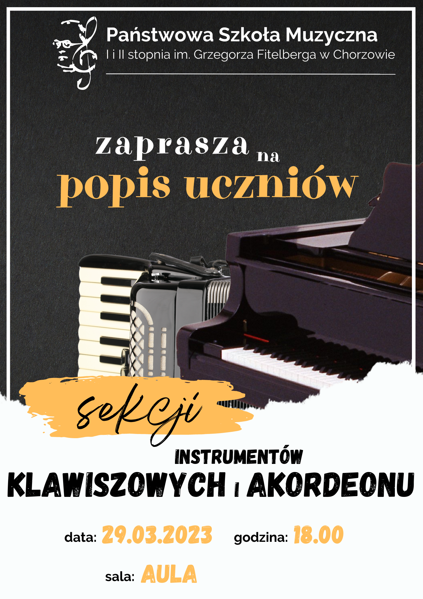 Wystąpią uczniowie szkoły muzycznej I stopnia z klasy fortepianu mgr Oliwii Stawowskiej, mgr Pauliny Kuzynin, mgr Luizy Kaczmarczyk, mgr Agnieszki Kulikowskiej-Owsiak, mgr Doroty Mańkowskiej.