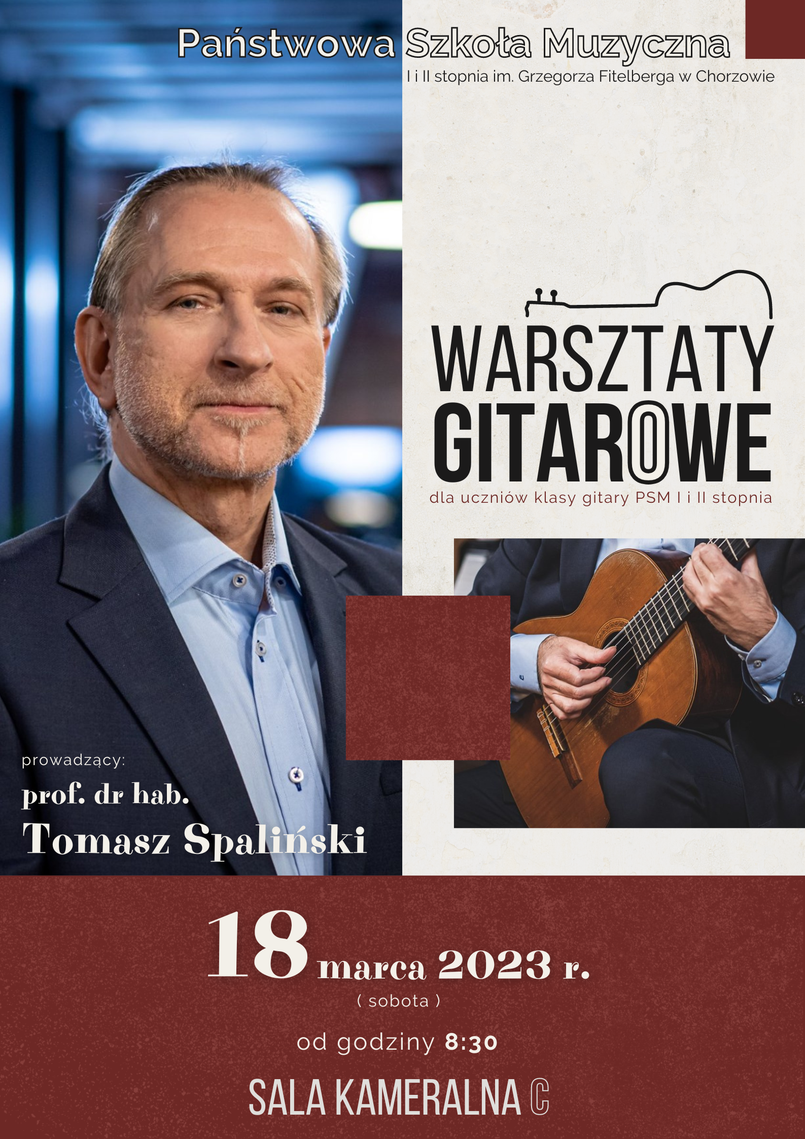 W dniu 18 marca 2023 r. odbędą się warsztaty dla uczniów klasy gitary PSM I i II stopnia które poprowadzi Pan prof. dr hab. Tomasz Spaliński.