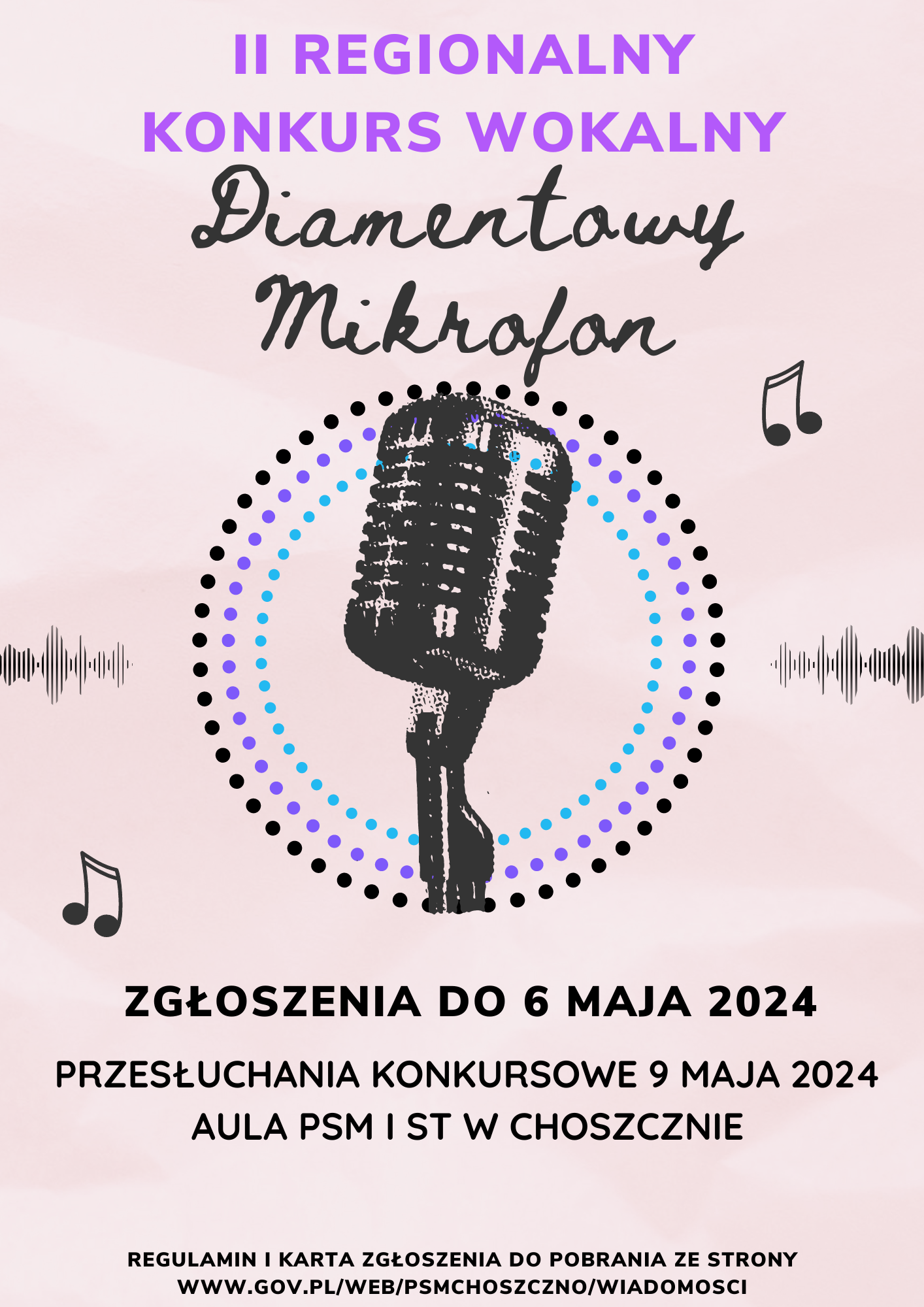 Zapraszamy do wzięcia udziału w II Regionalnym Konkursie Wokalnym "Diamentowy mikrofon", który odbędzie się w Auli naszej szkoły 9 maja 2024 roku.