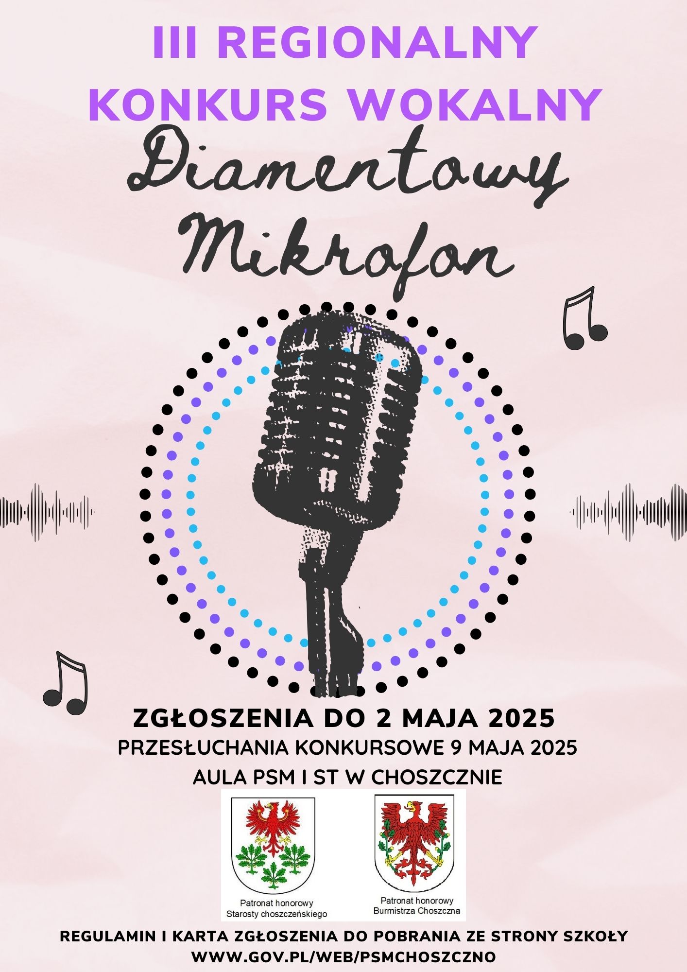 Regulamin konkursu "Diamentowy mikrofon" - 2025Regulamin_Konkursu.pdf 0.13MB Karta zgłoszenia " III Konkurs wokalny - Diamentowy mikrofon" - 2025