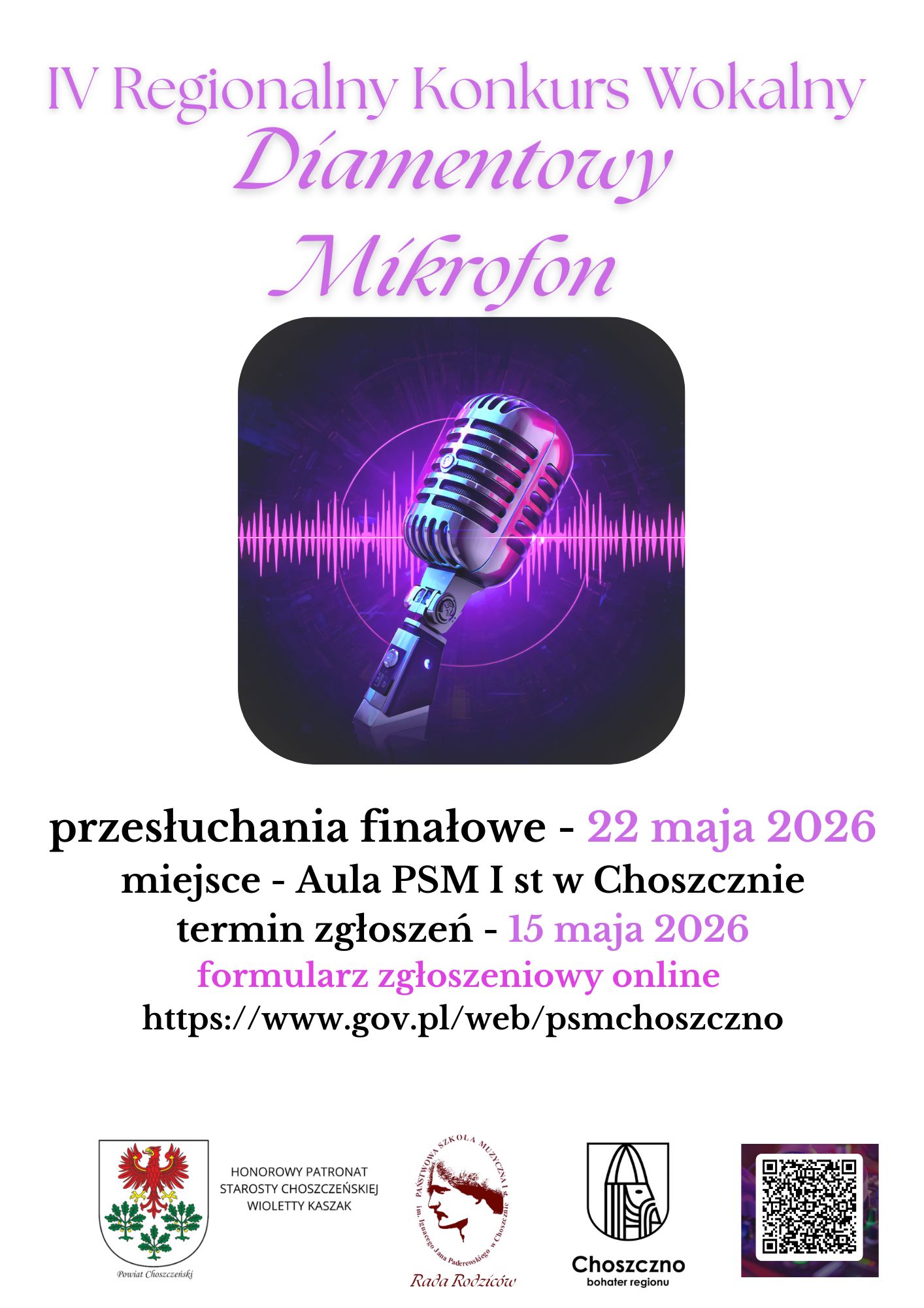 IV Regionalny Konkurs Wokalny "Diamentowy mikrofon" 09.04.2026 Materiały Diamentowy mikrofon - regulamin konkursu Regulamin_Konkursu_2026.pdf 0.22MB Zdjęcia (1) Pokaż zdjęcie 1 z galerii.
