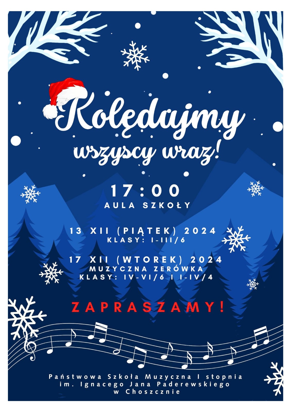 Poza koncertami porannymi 13 i 17 grudnia 2024 r., kiedy odwiedzają nas dzieci ze szkół i przedszkoli Choszczna i okolic, tradycją są także popołudniowe koncerty dla rodziców i gości naszych uczniów. Jak w latach poprzednich, popołudniowe koncerty rozpoczynają utwory grane przez nauczycieli, którzy następnie przekazują scenę uczniom.