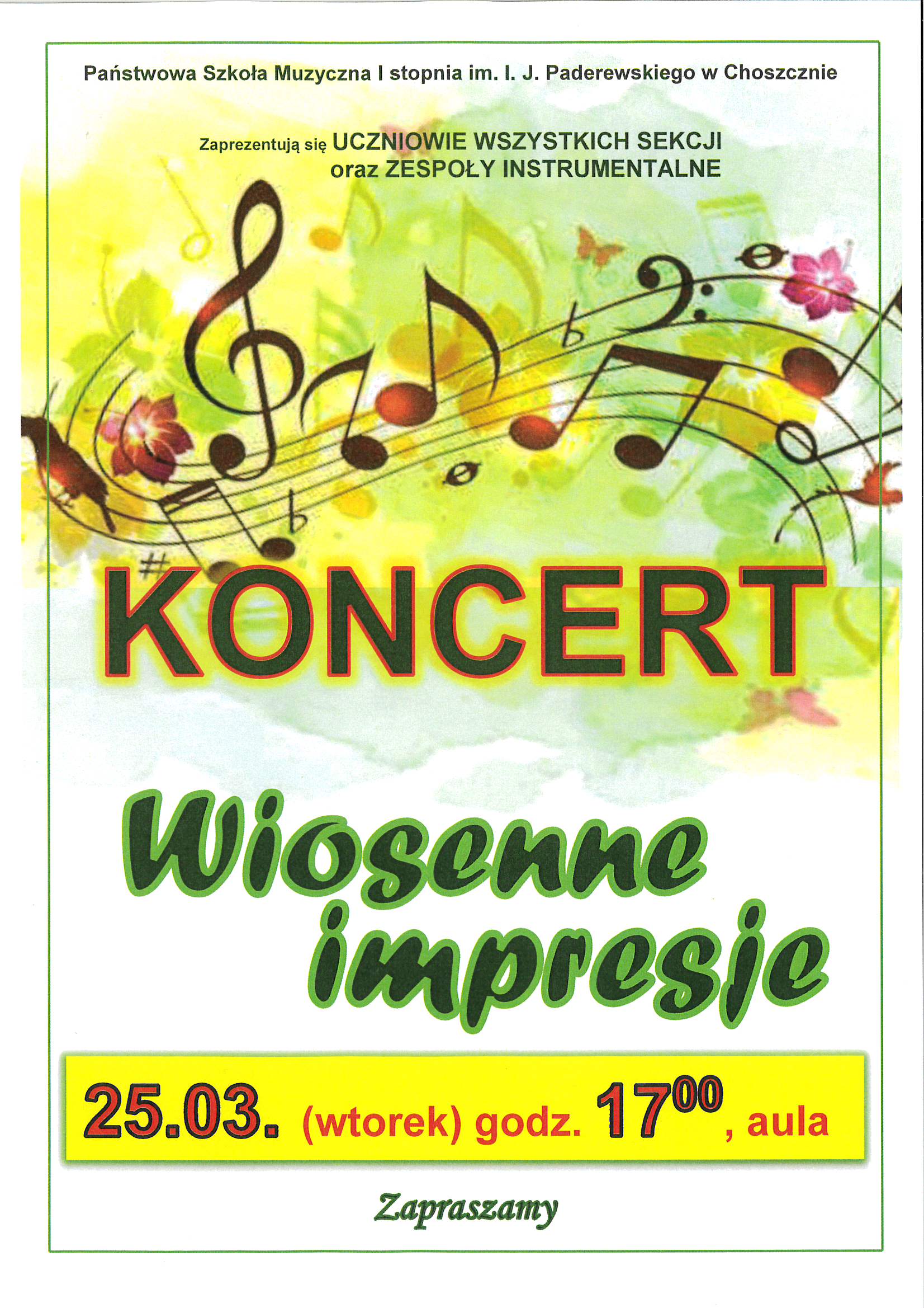 Poniżej na środku drukowanymi literami KONCERT - Wiosenne impresje" na dole strony w żółtej ramce czerwone cyfry 25.03 (wtorek) godz. 17:00, aula