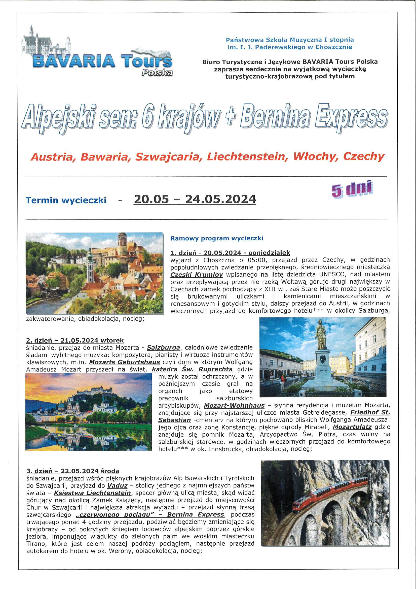 20 – 24 maja 2024 r. planowana jest wycieczka "Alpejski sen" do 6 krajów Europy.