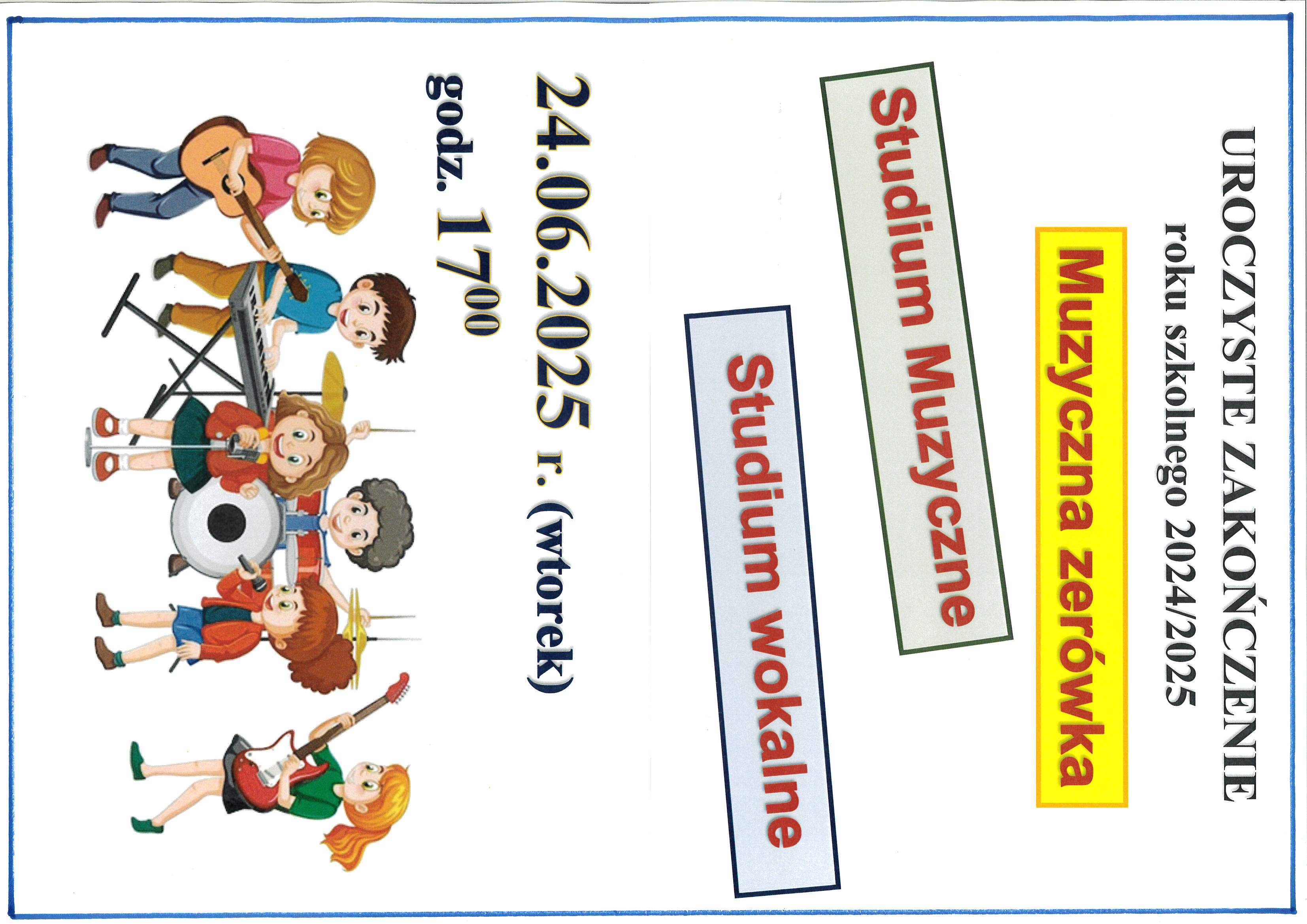 Od góry na białym tle wyśrodkowany tekst w 5 liniach: Uroczyste zakończenie roku szkolnego 2024/2025 Muzyczna Zerówka, Studium muzyczne, Studium wokalne. poniżej grafika dzieci grających na różnych instrumentach. Poniżej: 24.06.2025 r. (wtorek) godz. 17:00