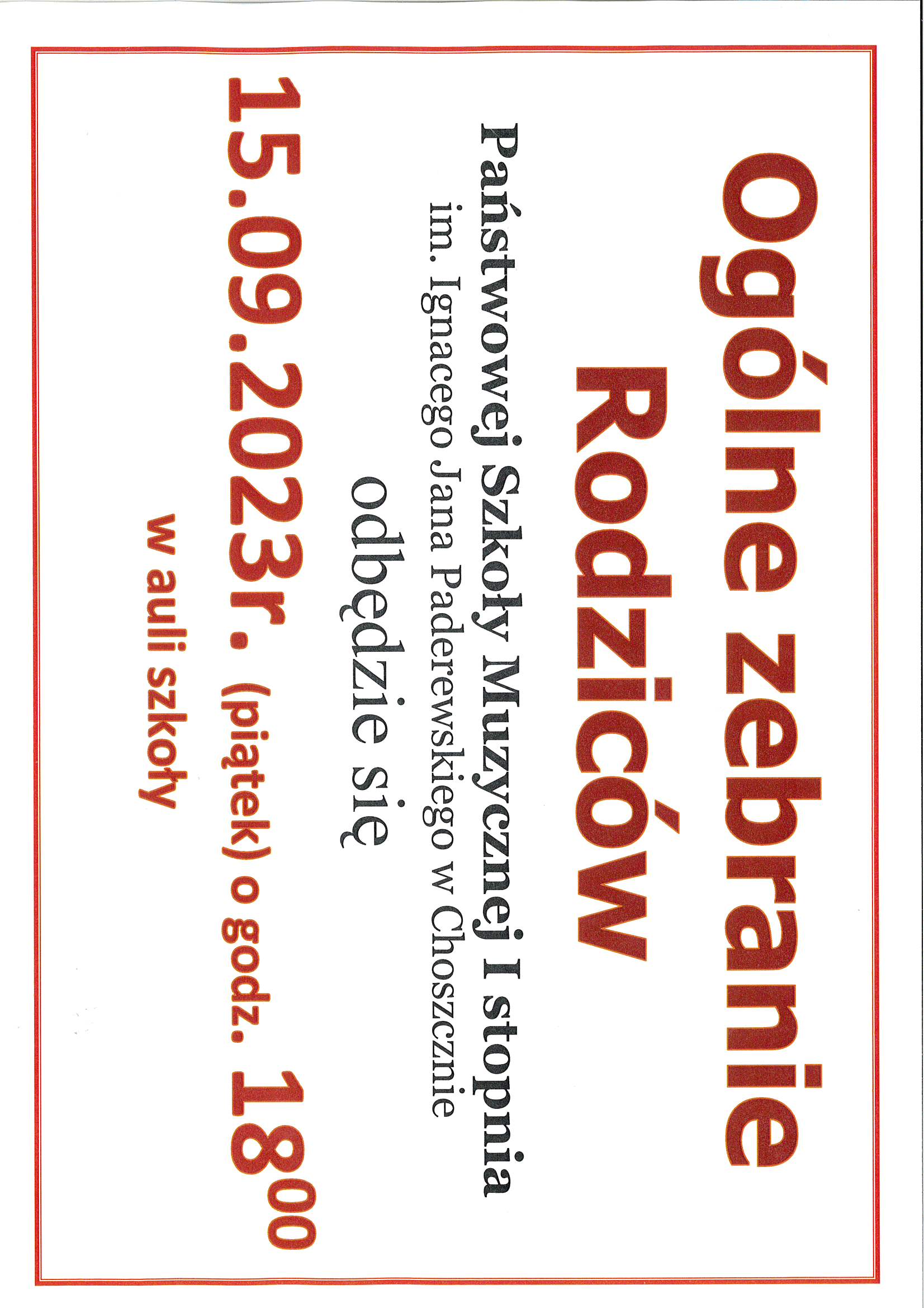 Zapraszamy wszystkich rodziców na ogólne zebranie w Państwowej Szkoły Muzycznej im. Ignacego Jana Paderewskiego w Choszcznie odbędzie się 15 września 2023 roku (piątek) o godzinie 18:00 w auli szkoły.