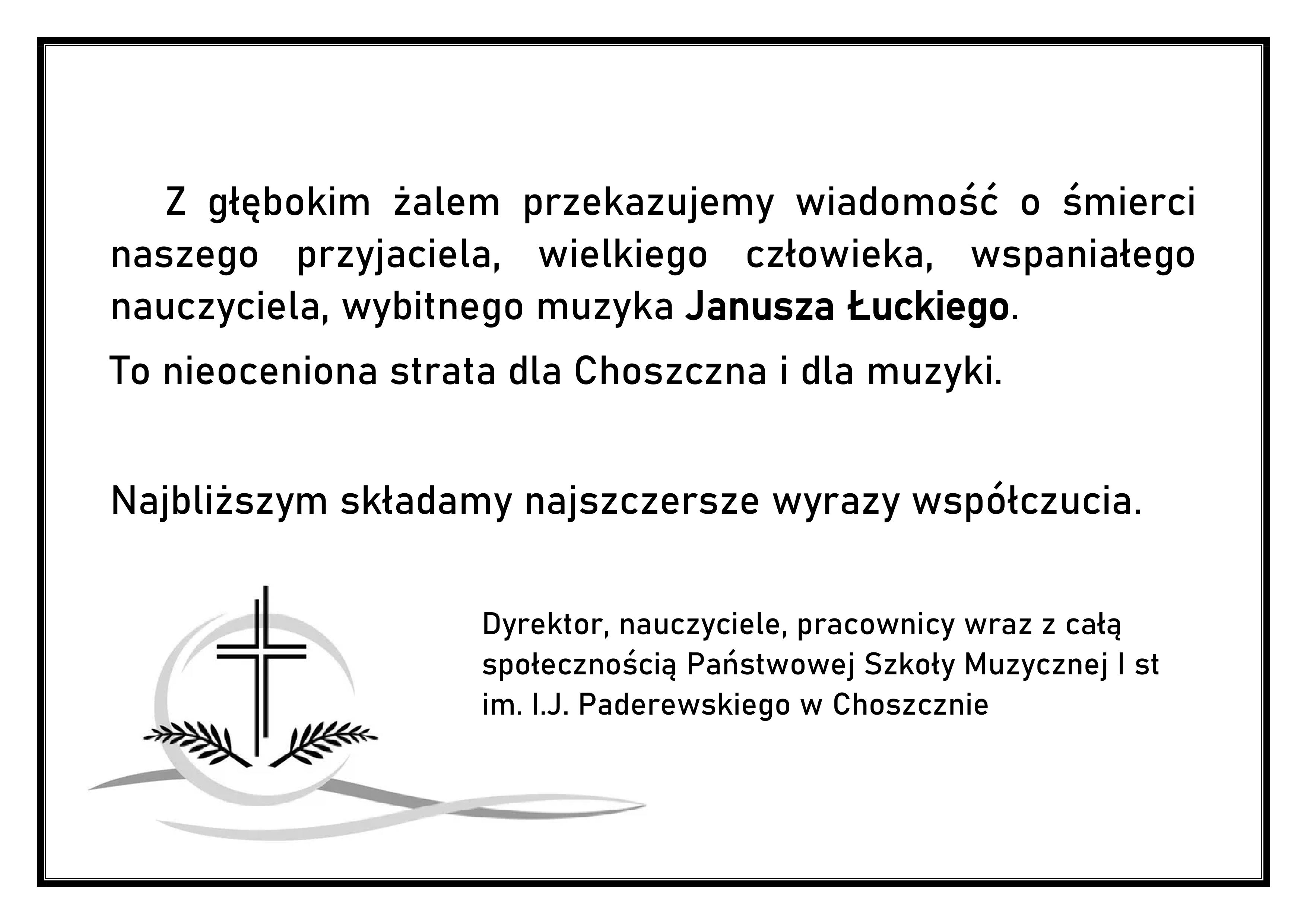 Z głębokim żalem przekazujemy wiadomość o śmierci naszego przyjaciela, wielkiego nauczyciela, wybitnego muzyka Janusza Łuckiego. Najbliższym składamy najszczersze wyrazy współczucia.