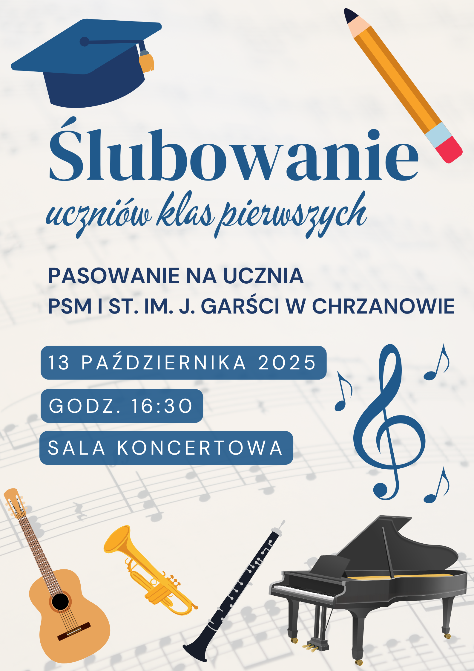 Z radością zapraszamy na uroczyste ślubowanie uczniów klas pierwszych, które odbędzie się 13 października 2025 r. o godz. 16:30, w Sali Koncertowej naszej szkoły.