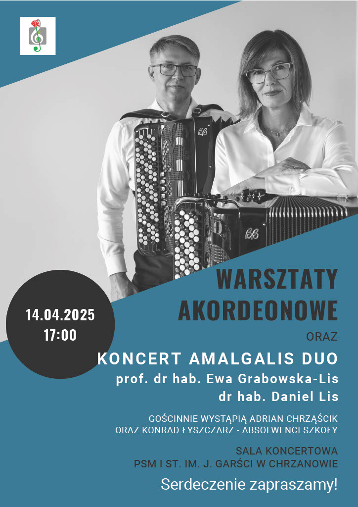 Dnia 14 kwietnia 2025 roku w naszej szkole odbędą się warsztaty akordeonowe. Poprowadzą je prof. dr hab. Ewa Grabowska-Lis (Uniwersytet Jana Długosza w Częstochowie) oraz dr hab. Daniel Lis (Akademia Muzyczna w Katowicach).