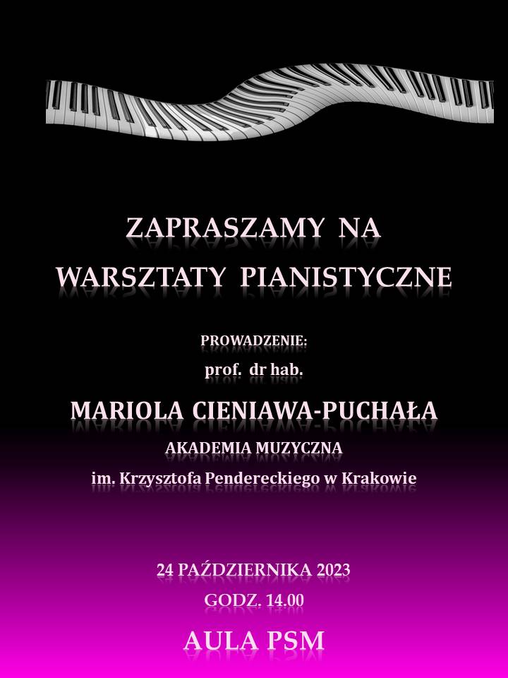 Zapraszamy na warsztaty pianistyczne prowadzone przez prof.dr hab. Mariolę Cieniawe-Puchała. które odbędą się 24 października 2023 r. o godz. 14.00 w naszej auli.