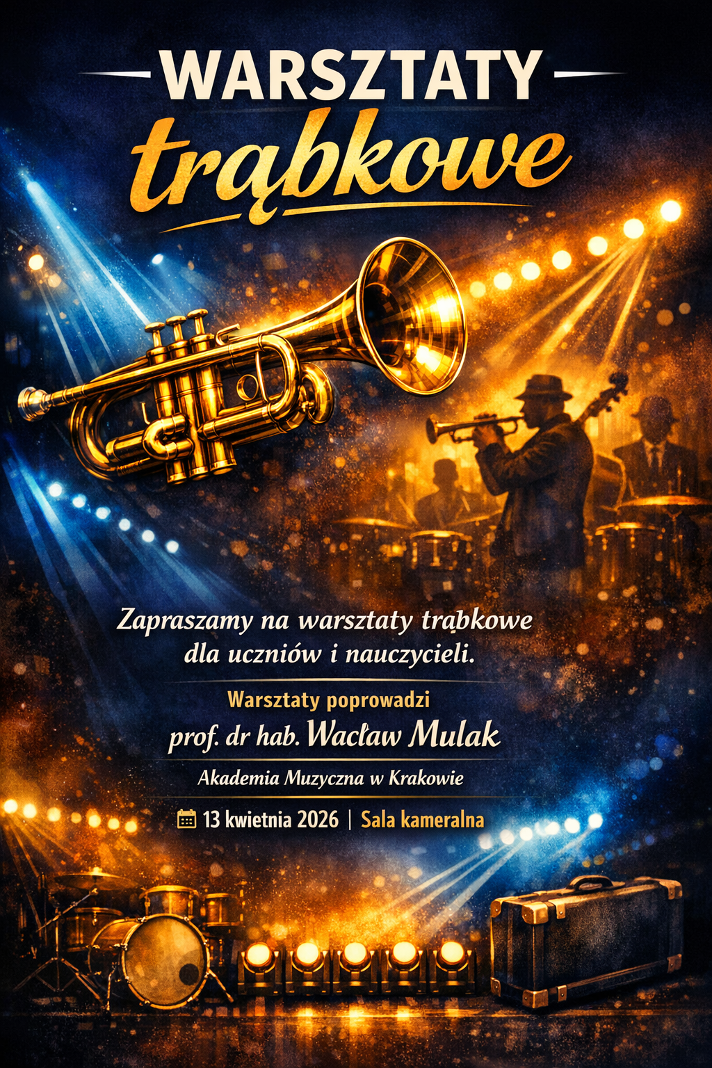 Serdecznie zapraszamy na warsztaty trąbkowe uczniów i nauczycieli, które odbędą się 13 kwietnia 2026 na sali kameralnej w naszej szkole.