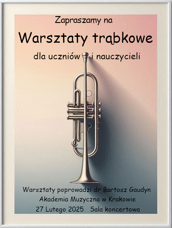 Serdecznie zapraszamy na warsztaty trąbkowe uczniów i nauczycieli, które odbędą się 27 Lutego 2025 na sali koncertowej w naszej szkole.