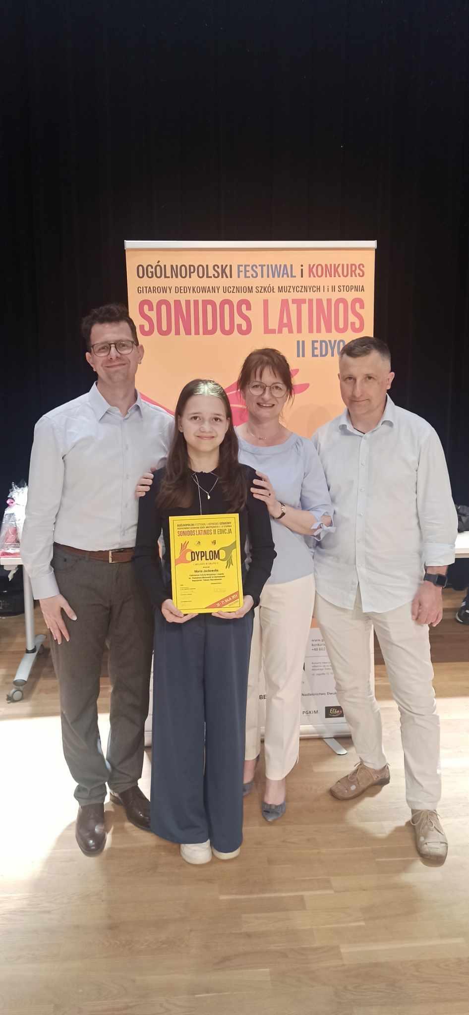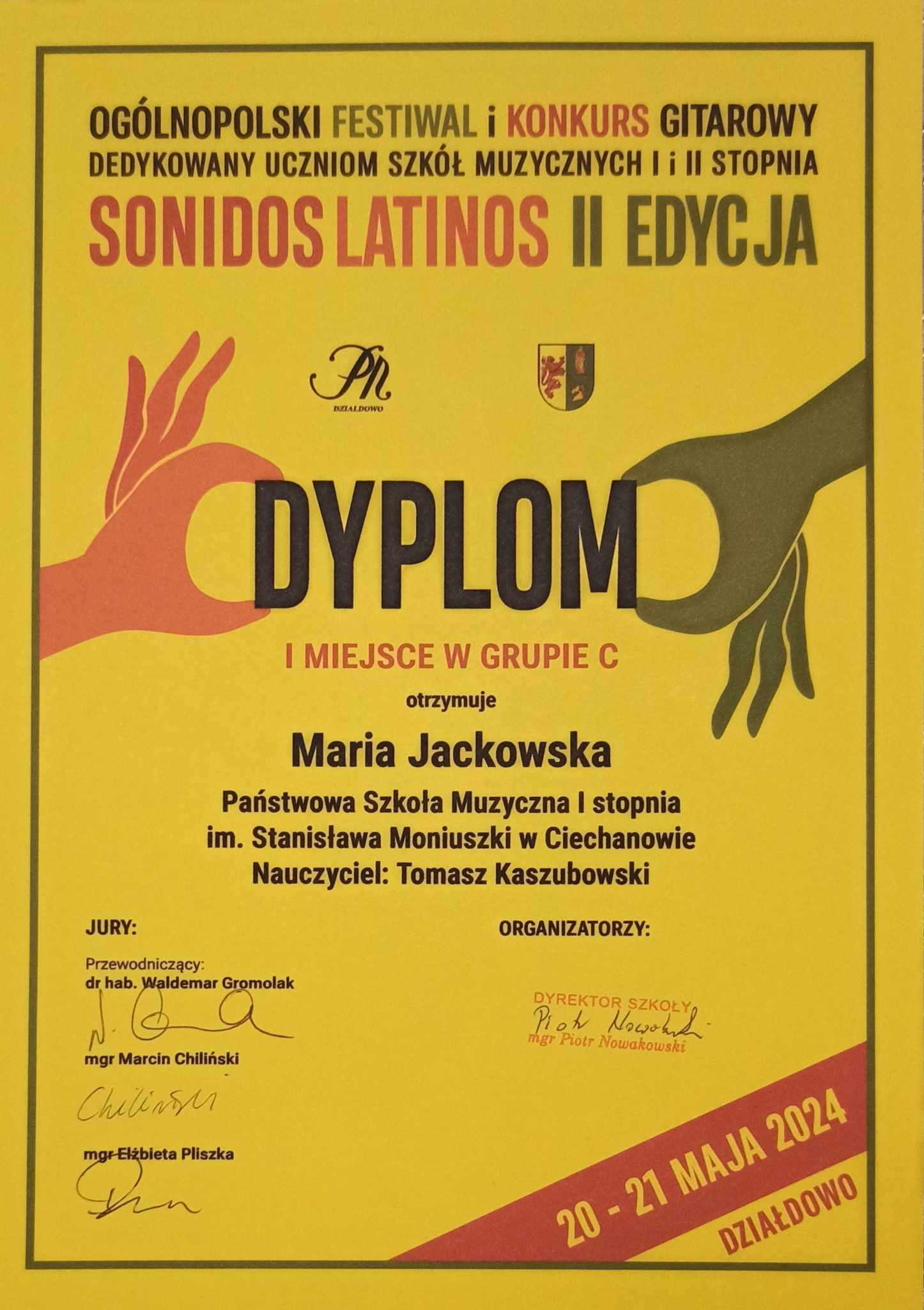 Serdeczne gratulacje dla Marii Jackowskiej uczennicy Tomasza Kaszubowskiego za zajęcie I miejsca (w grupie C) w Ogólnopolskim Festiwalu i Konkursie Gitarowym „SONIDOS LATINOS” Edycja II w Działdowie.