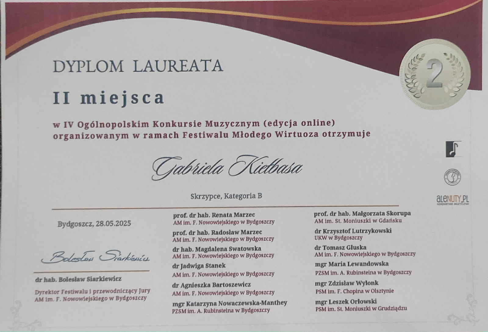 GRATULACJE!! dla Gabrieli Kiełbasa uczennicy Justyny Kierczyńskiej - Kulińskiej za zdobycie II Miejsca w kategorii B w IV Ogólnopolskim Konkursie Muzycznym „Festiwal Młodego Wirtuoza” edycja online
