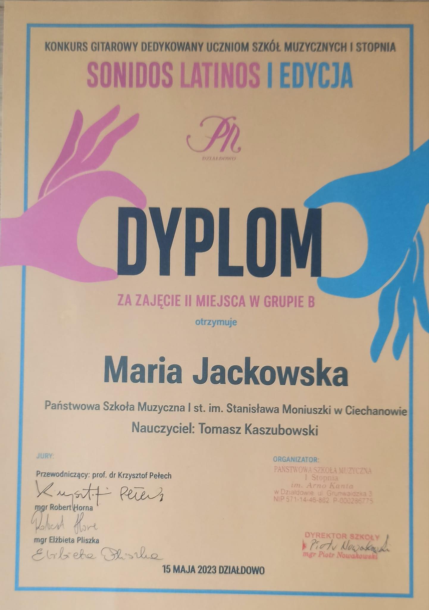 Marysia zajęła II miejsce w grupie B ( I nagrody nie przyznano) w I Konkursie Gitarowym Dedykowanym Uczniom Szkół Muzycznych I stopnia „Sonidos Latinos” w Działdowie.