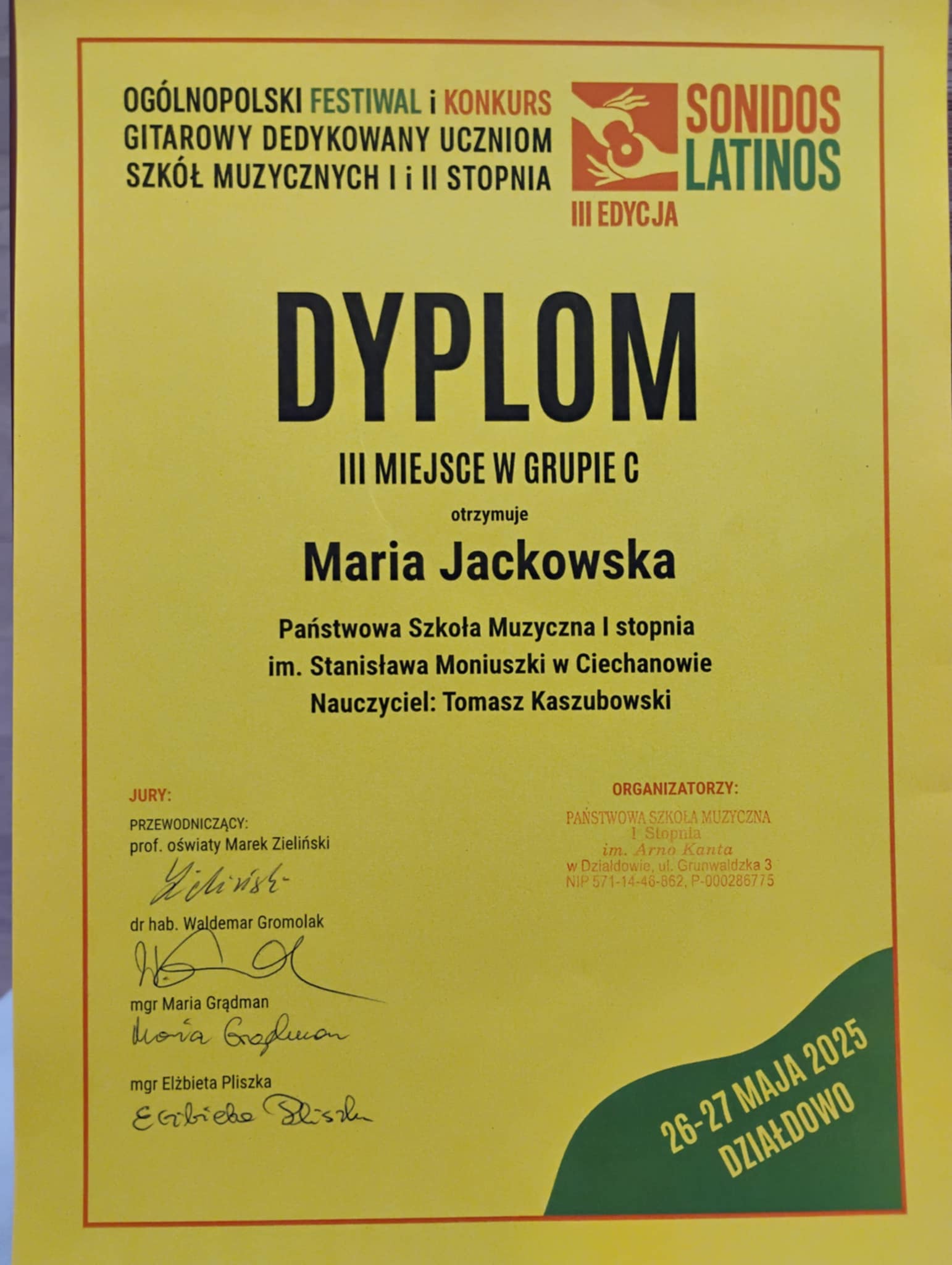 Serdeczne gratulacje dla Marii Jackowskiej uczennicy Tomasza Kaszubowskiego za zajęcie III miejsca (w grupie C) w Ogólnopolskim Festiwalu i Konkursie Gitarowym „SONIDOS LATINOS” Edycja III w Działdowie.