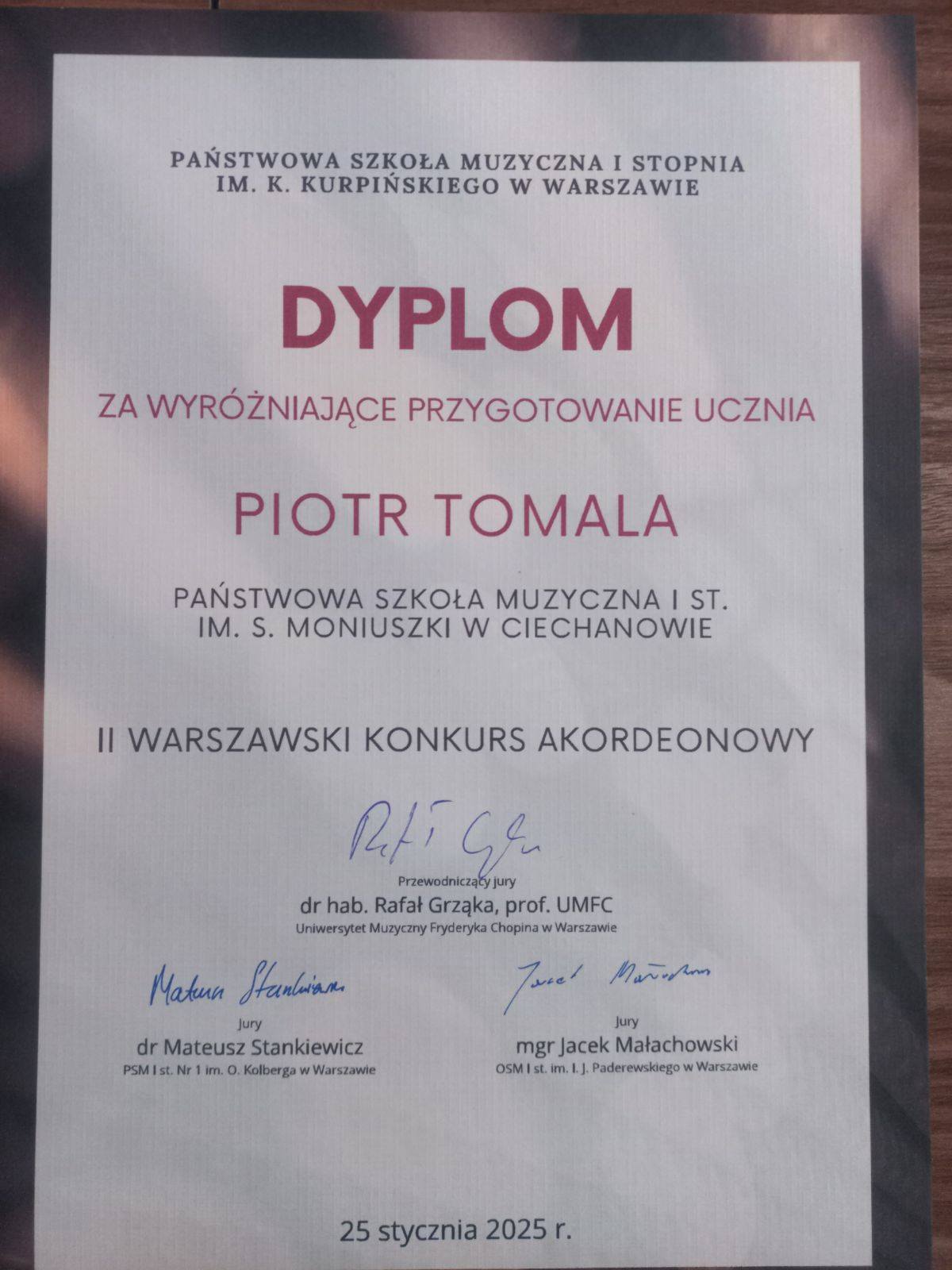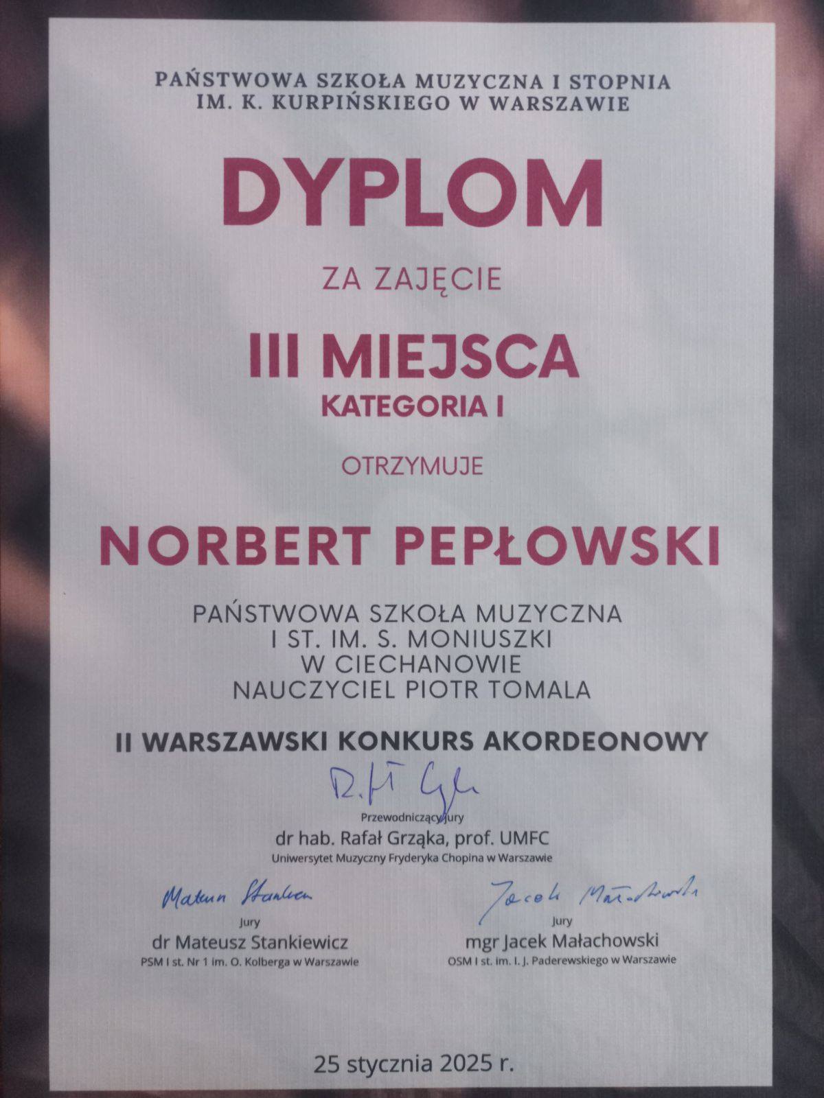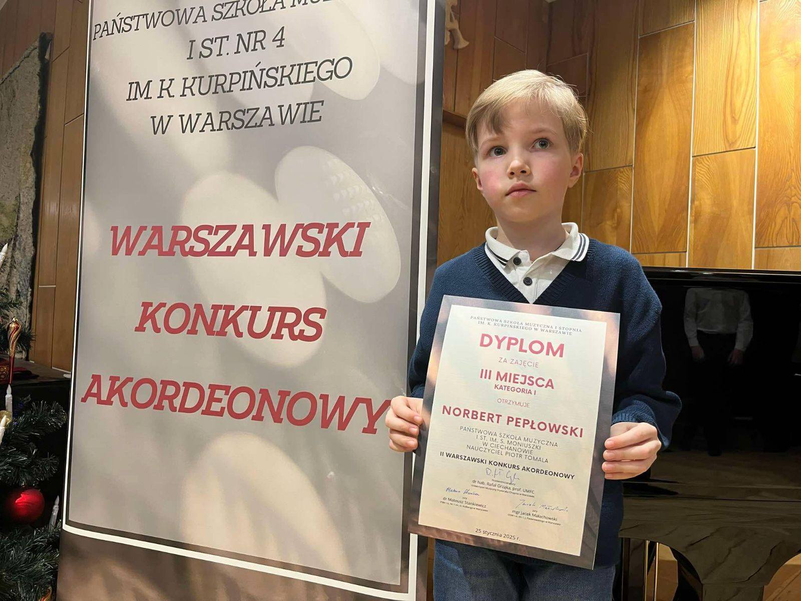Dla Norberta Pepłowskiego ucznia Piotra Tomali za zdobycie III Miejsca (KATEGORIA I) w II WARSZAWSKIM KONKURSIE AKORDEONOWYM